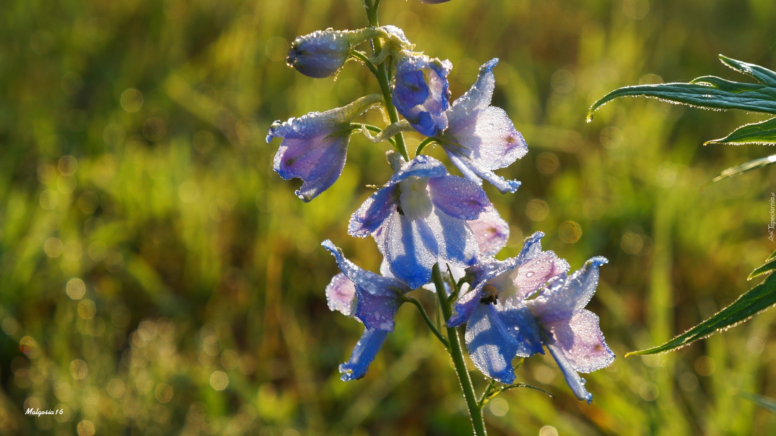 Edytor tapety: Ostróżka ogrodowa, Niebieskie, Kwiaty, Krople, Rosa