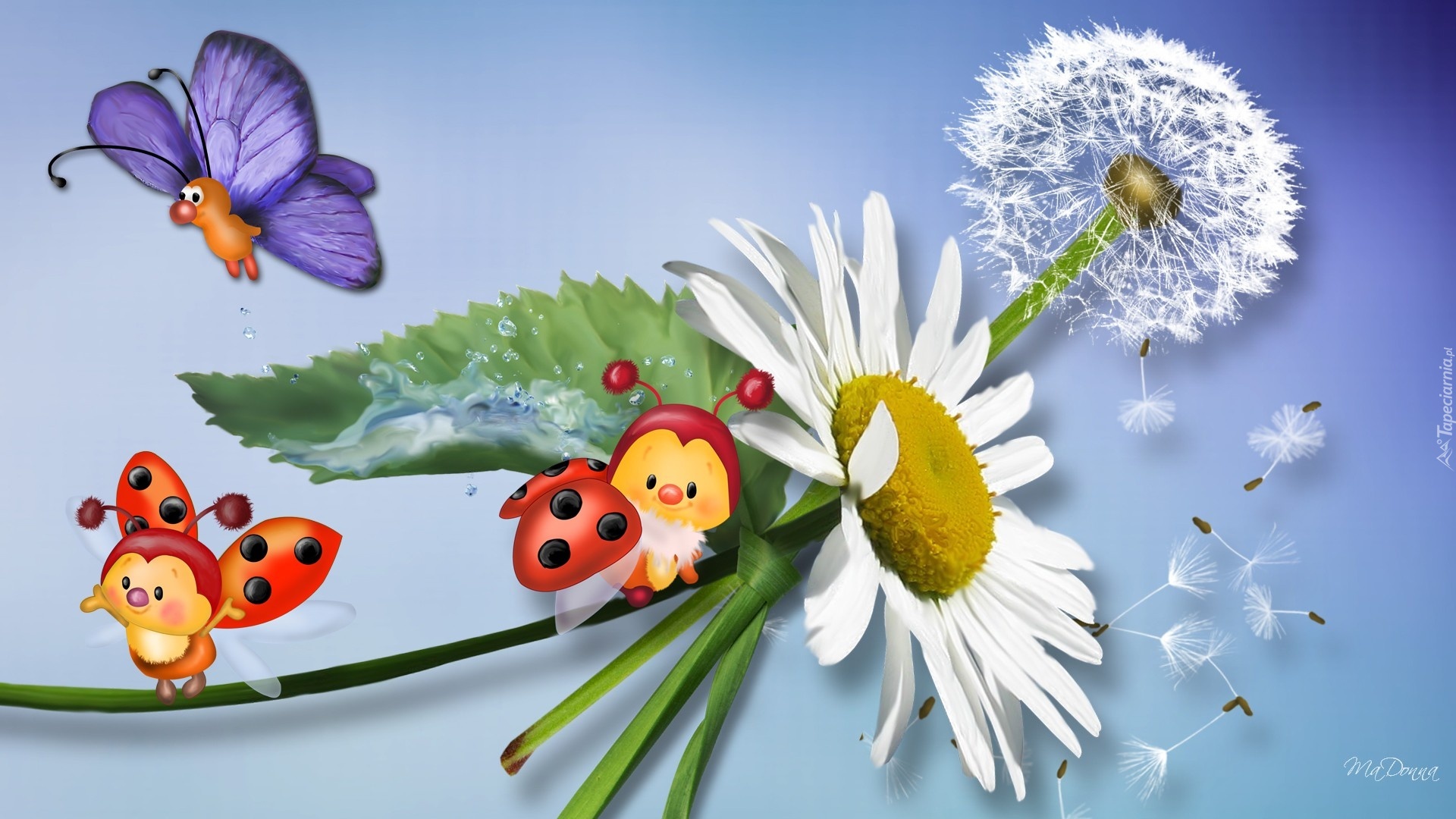 Edytor tapety: Biedronki, Motyl, Kwiat, Mlecz, Liść