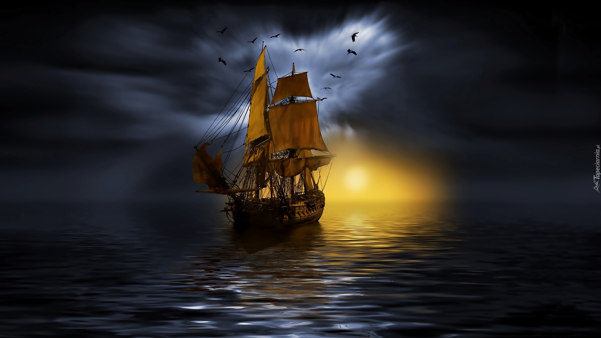 Edytor tapety: Świt, Wschód Słońca, Morze, Żaglowiec, Ptaki
