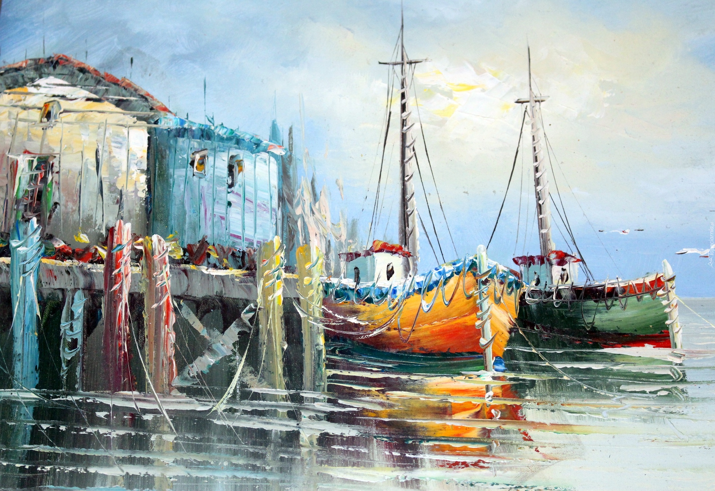 Edytor tapety: Obraz, Olejny, Marynistyka, Nabrzeże, Portowe, Morze, Kutry