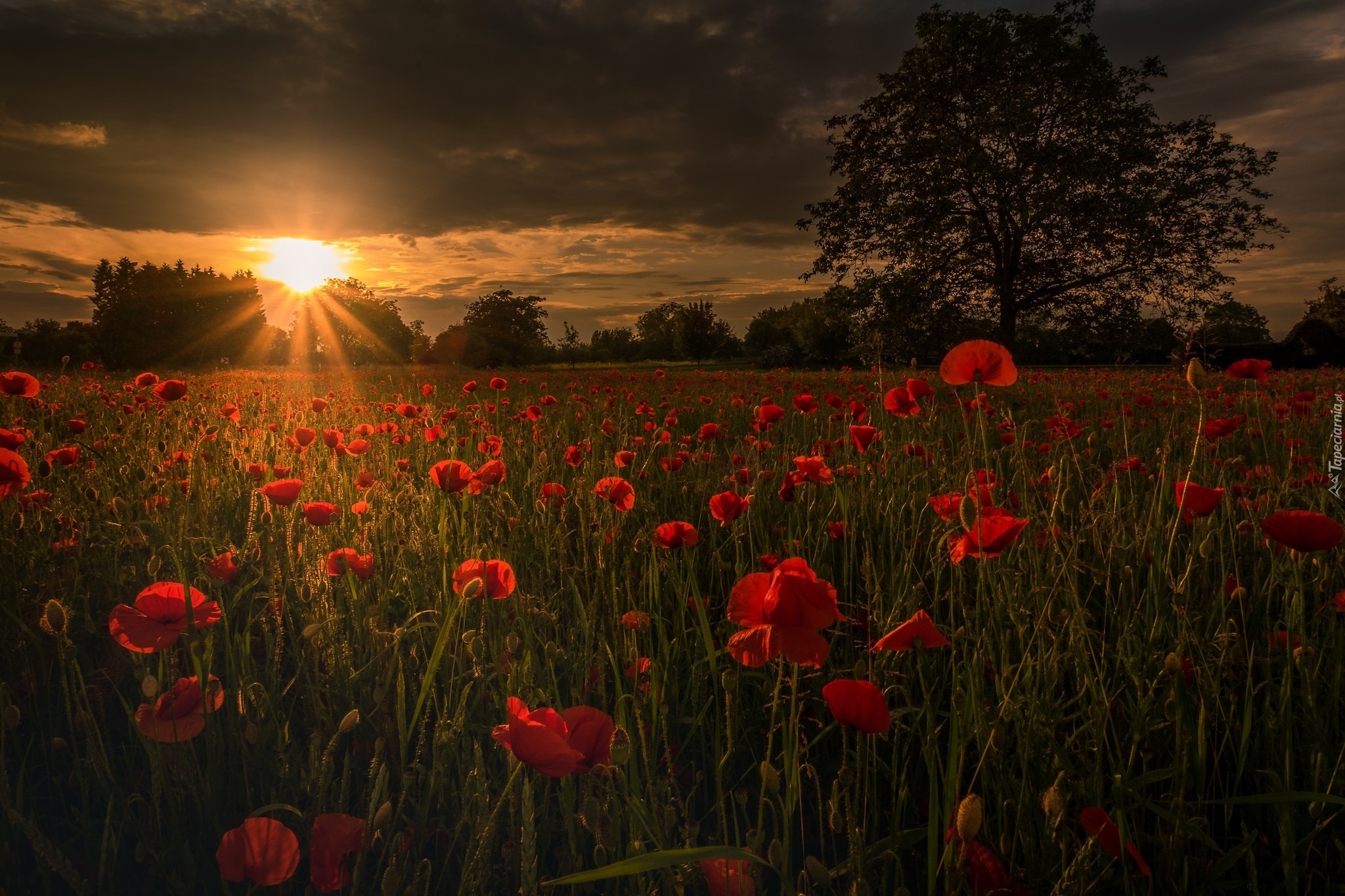 Edytor tapety: Zachód słońca, Drzewa, Maki
