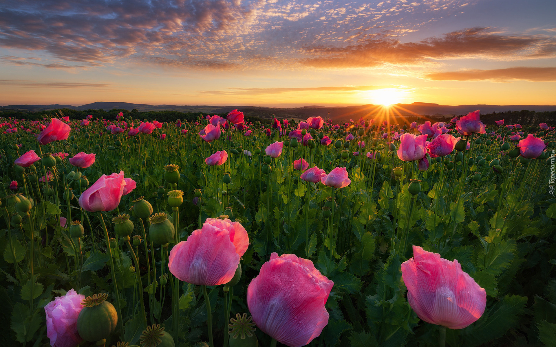Edytor tapety: Plantacja, Różowe, Maki, Promienie Słońca