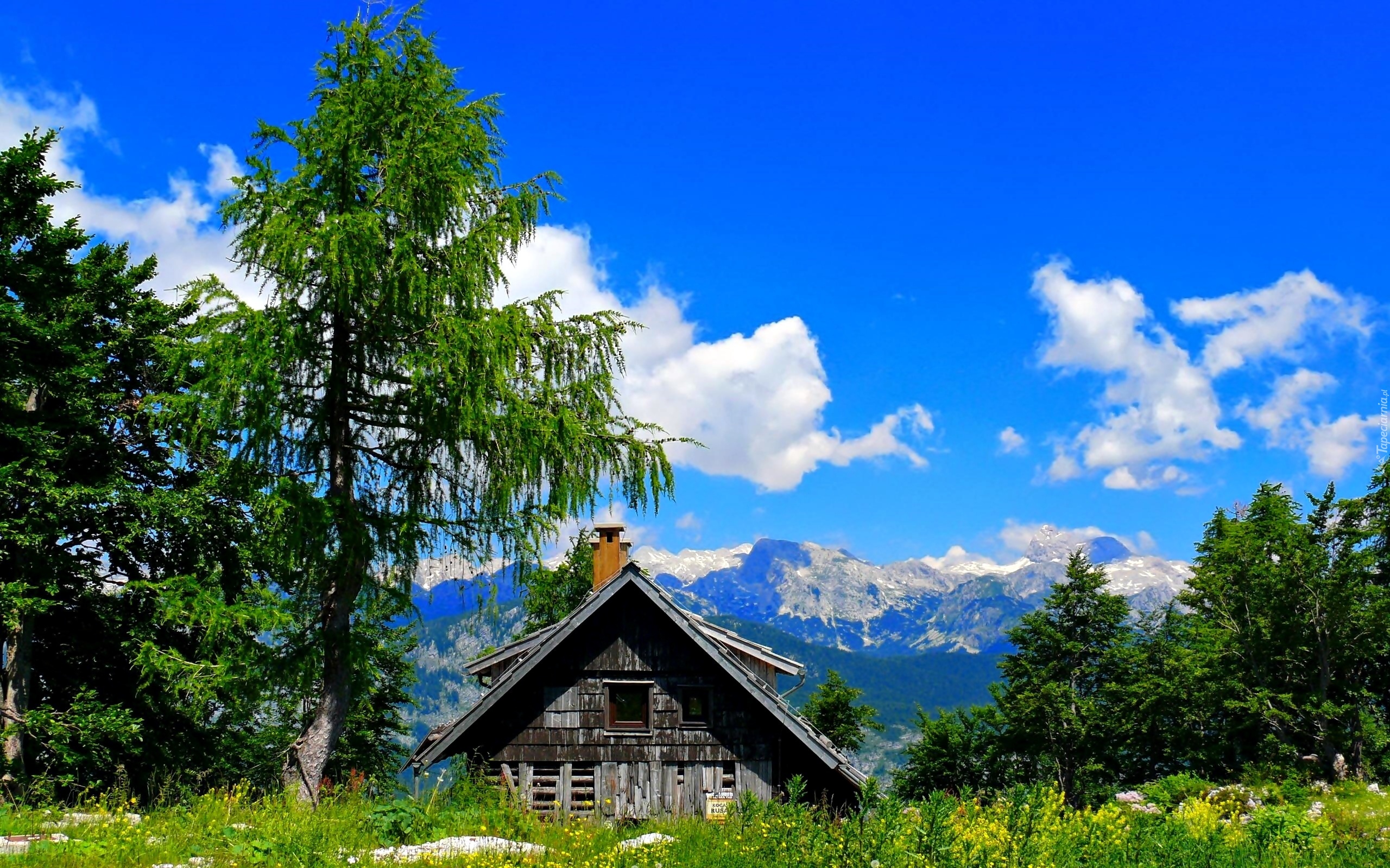 Edytor tapety: Chata, W, Górach, Drzewa, Chmury, Kwiaty
