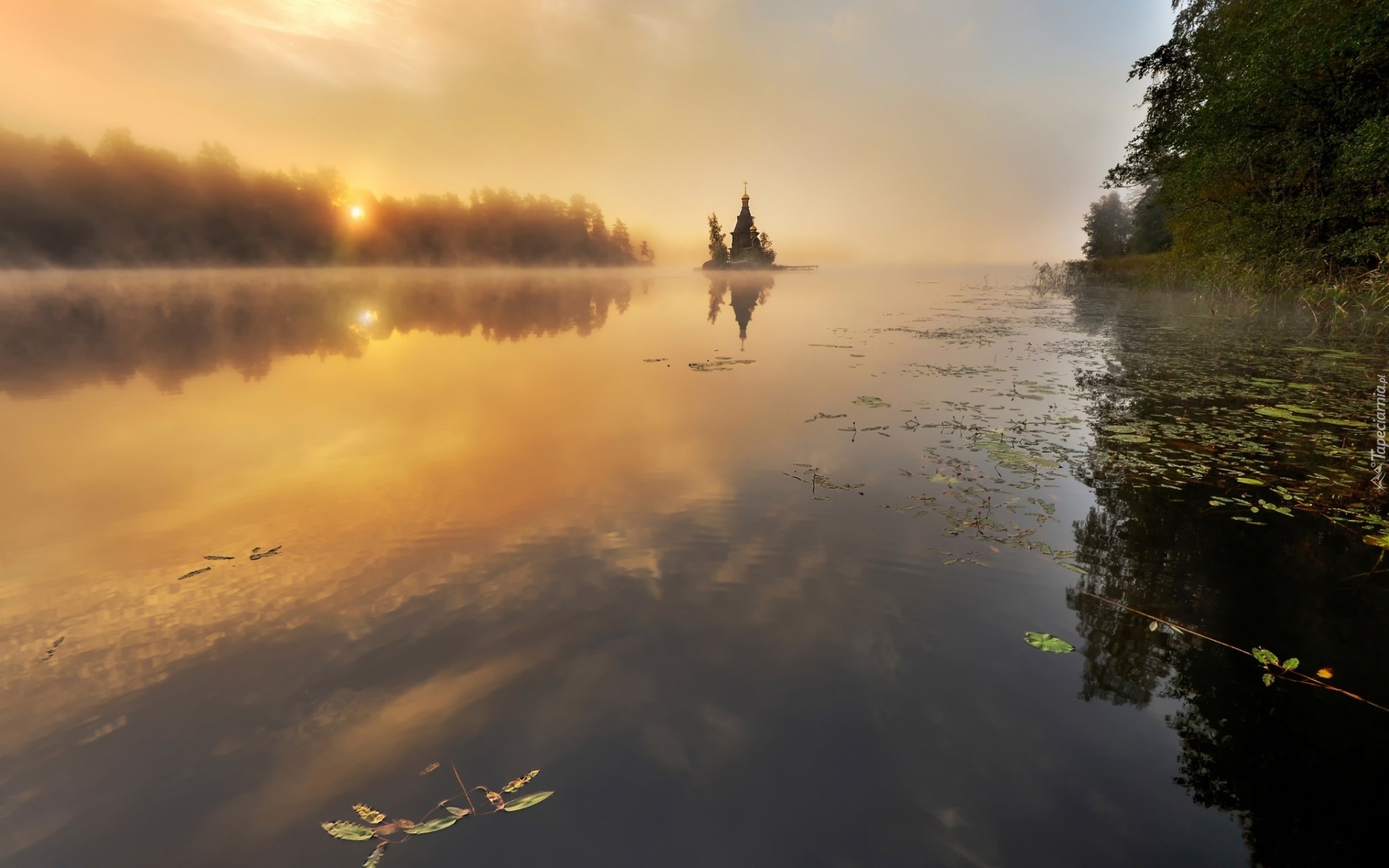 Edytor tapety: Jezioro, Mgła, Cerkiew, Las