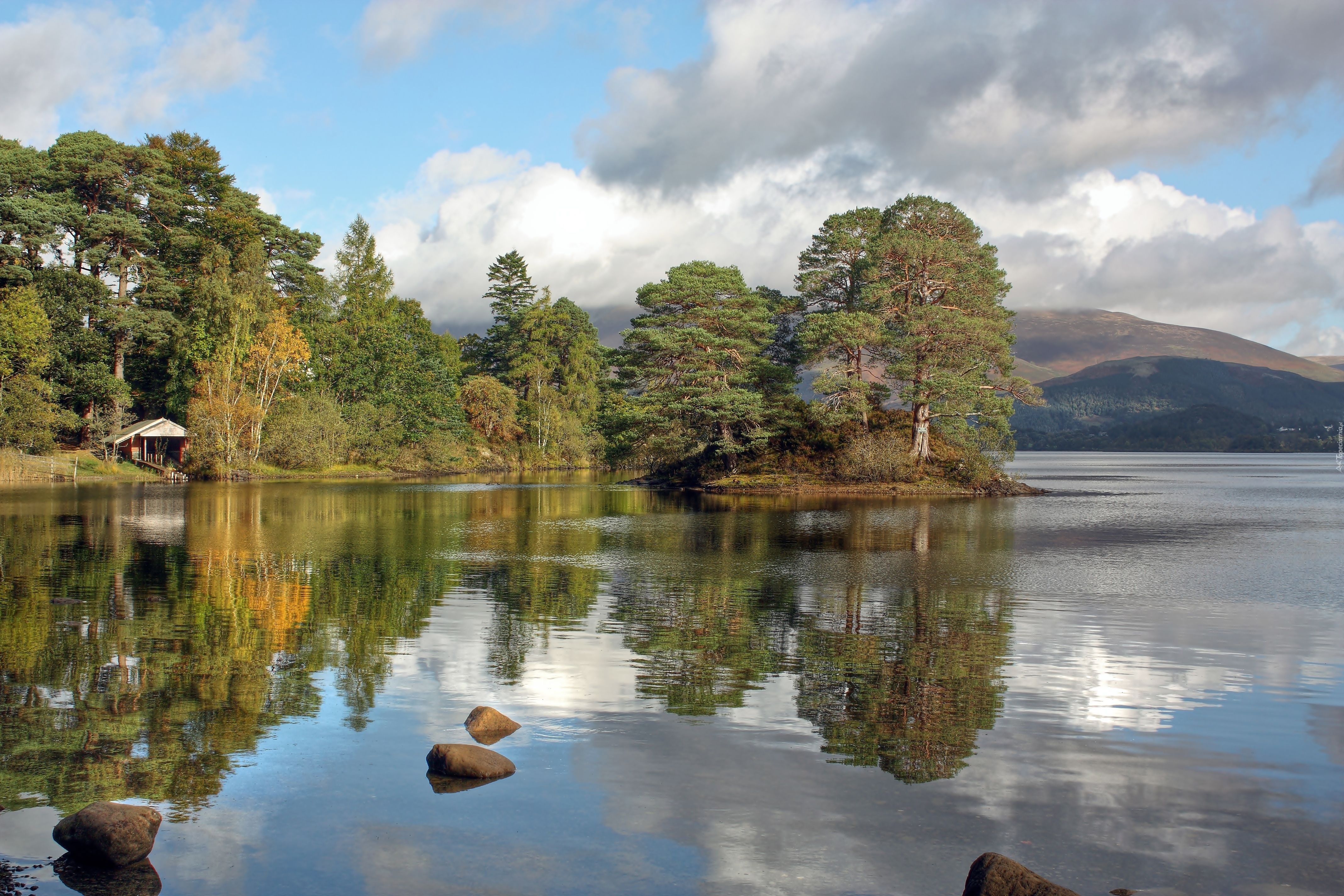 Edytor tapety: Rzeka, Drzewa, Góry, Kamienie, Dom