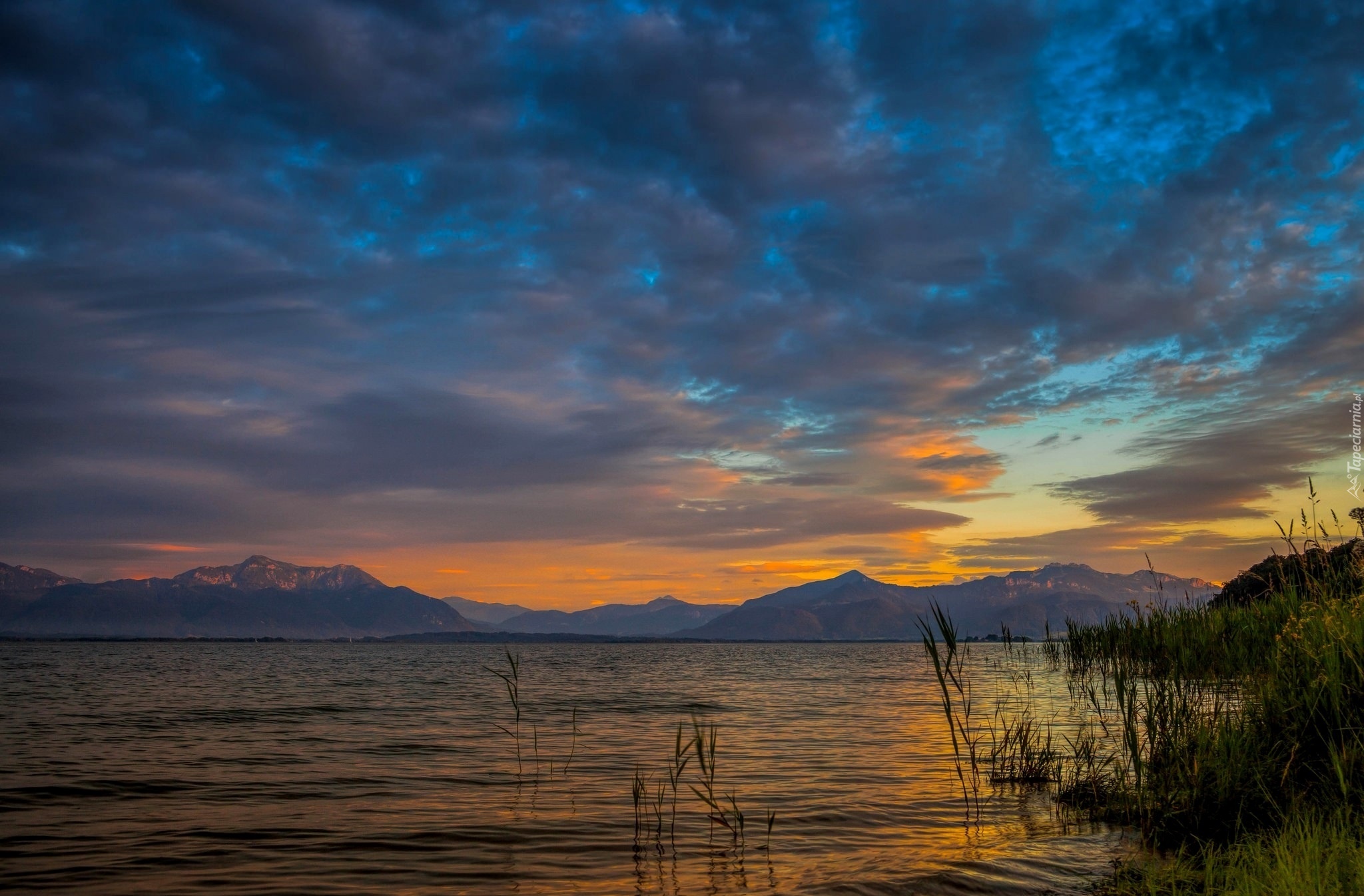 Edytor tapety: Jezioro, Góry, Trawy, Zachód, Słońca