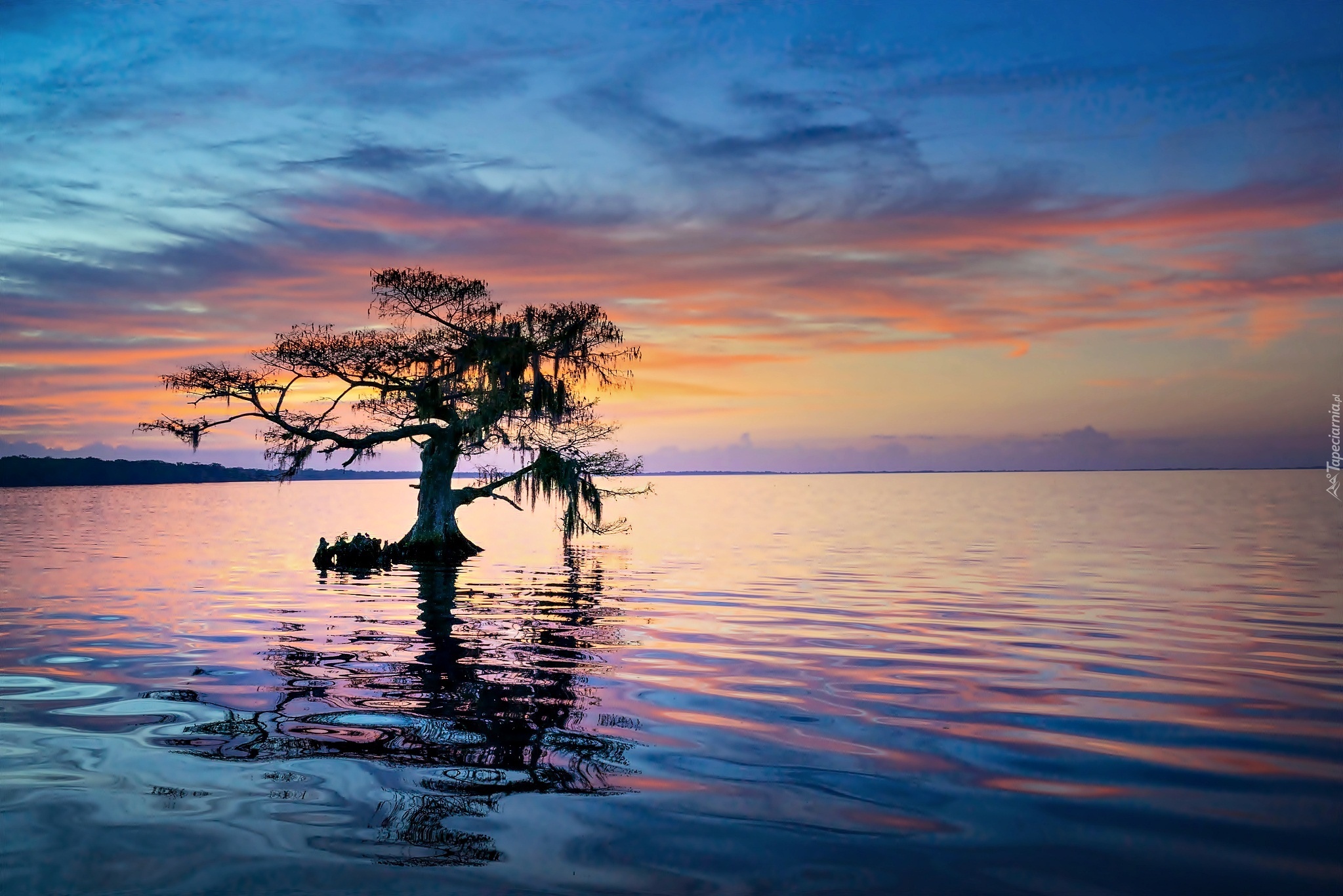 Edytor tapety: Jezioro, Drzewo, Zachód, Słońca
