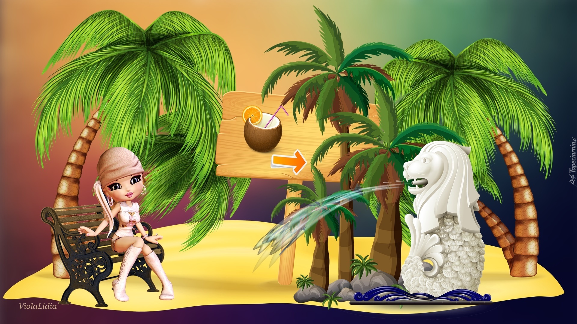 Edytor tapety: Grafika, Park, Palmy, Fontanna, Laleczka