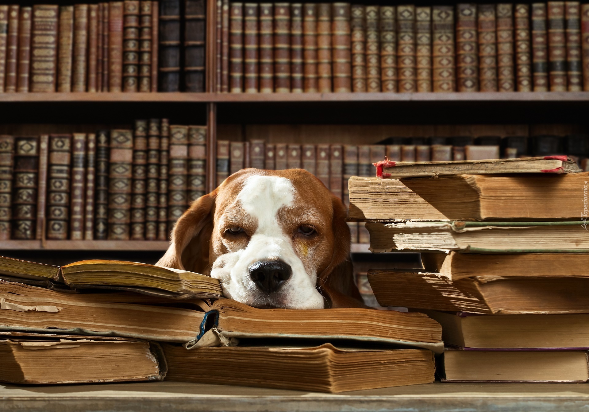 Edytor tapety: Śpiący, Pies, Książki, Biblioteczka, Śmieszne