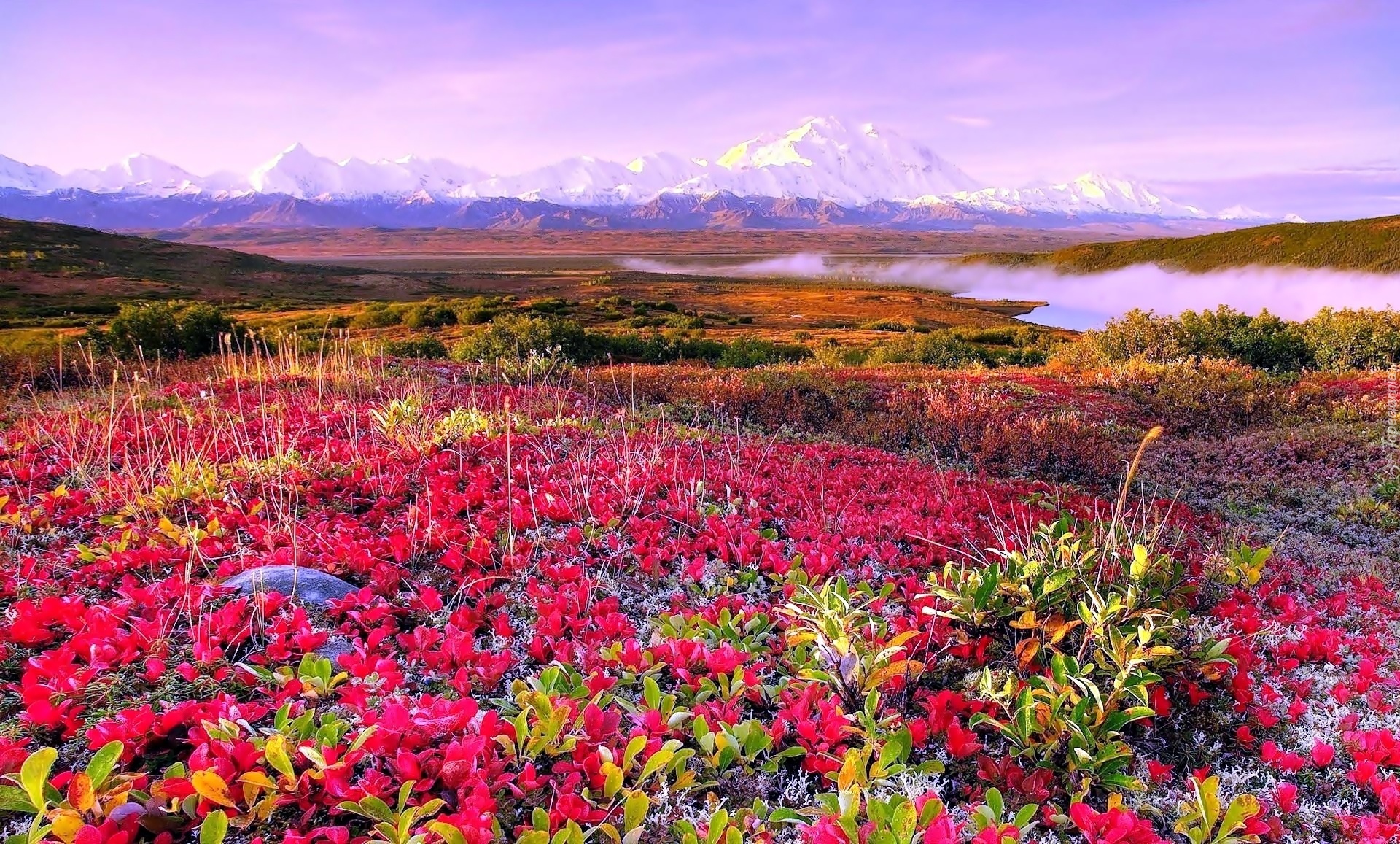 Edytor tapety: Góry, Rzeka, Mgła, Łąka, Kwiaty