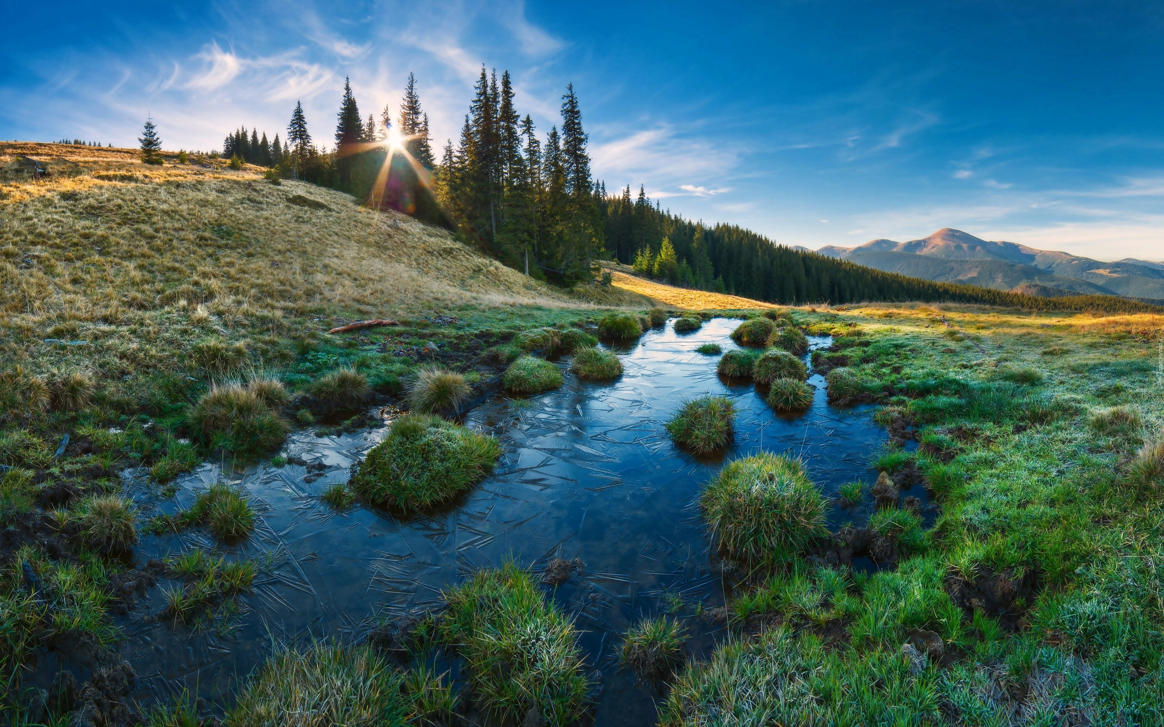 Edytor tapety: Wzgórza, Rzeka, Promienie, Słońca, Kępy, Trawy
