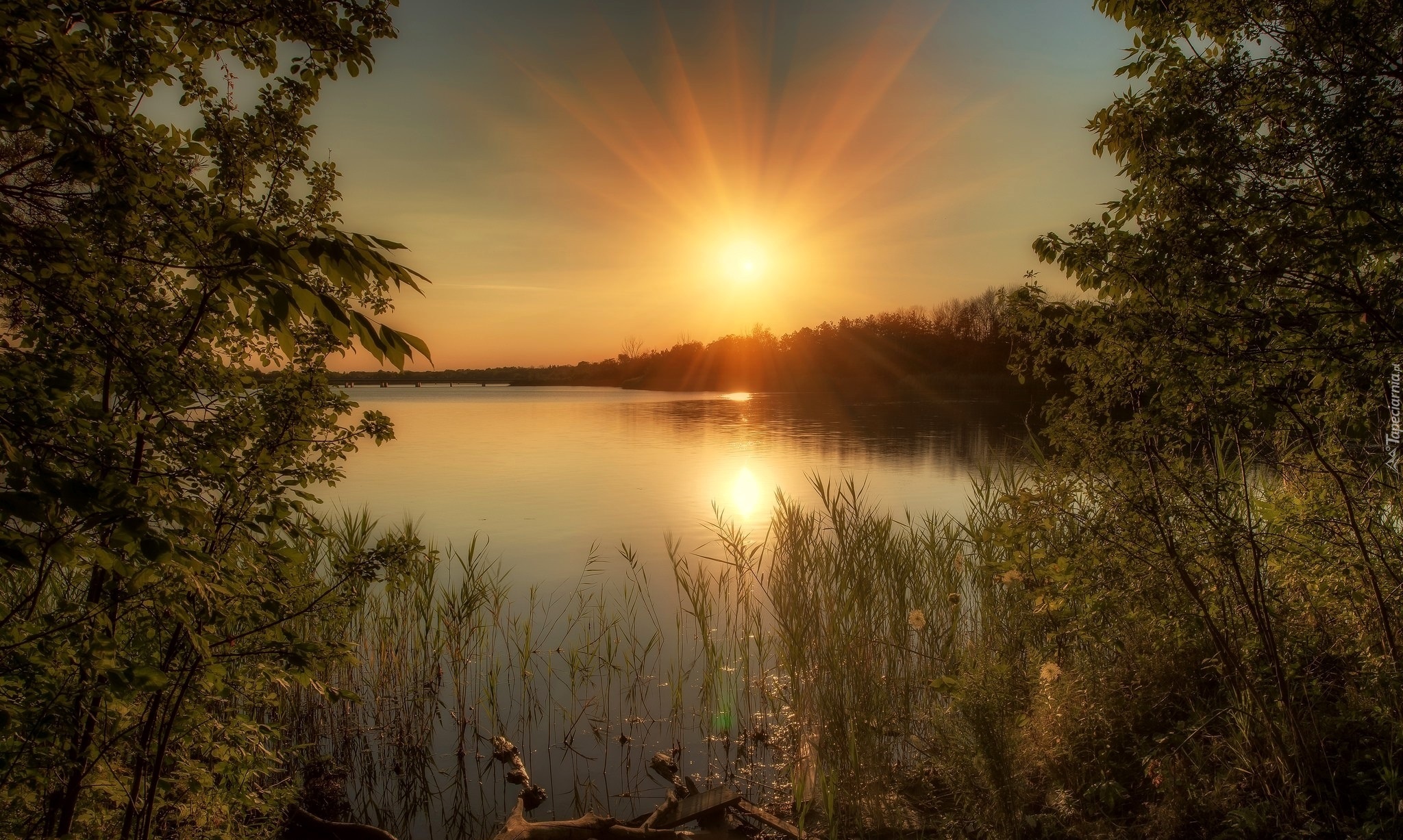 Edytor tapety: Jezioro, Zachód, Słońca, Drzewa, Trawy