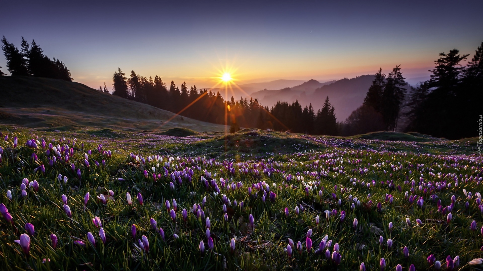 Edytor tapety: Łąka, Krokusy, Góry, Świt