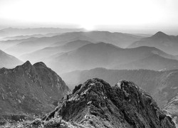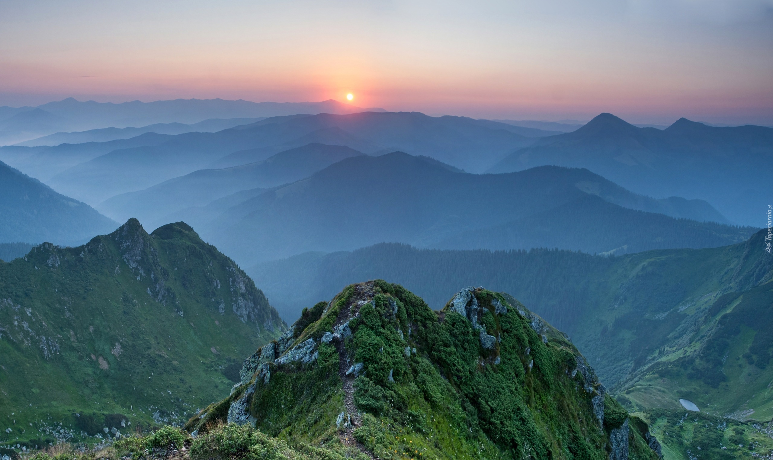 Edytor tapety: Góry, Mgła, Wschód słońca