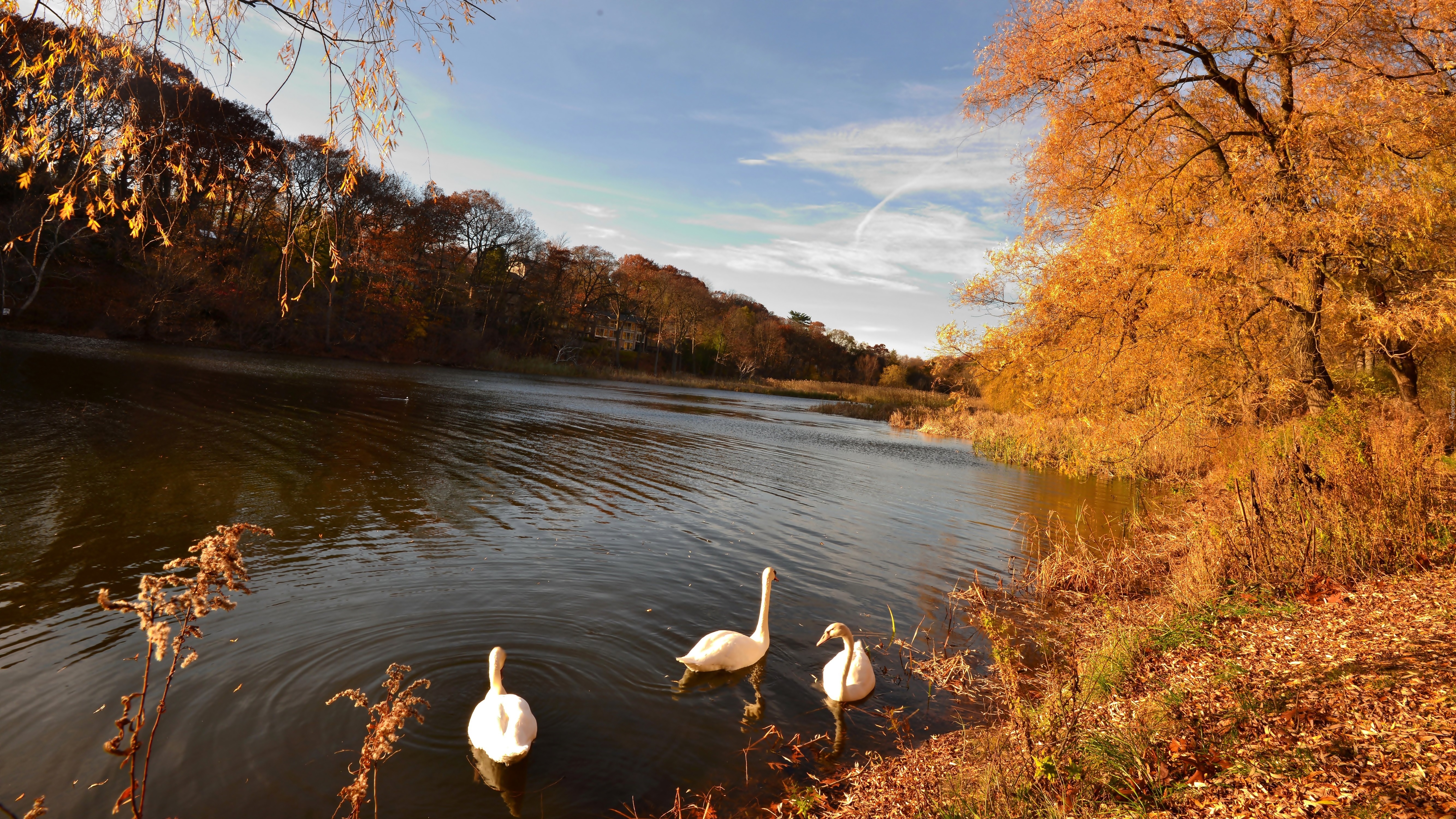 Edytor tapety: Jezioro, Jesień, Łabędzie, Drzewa