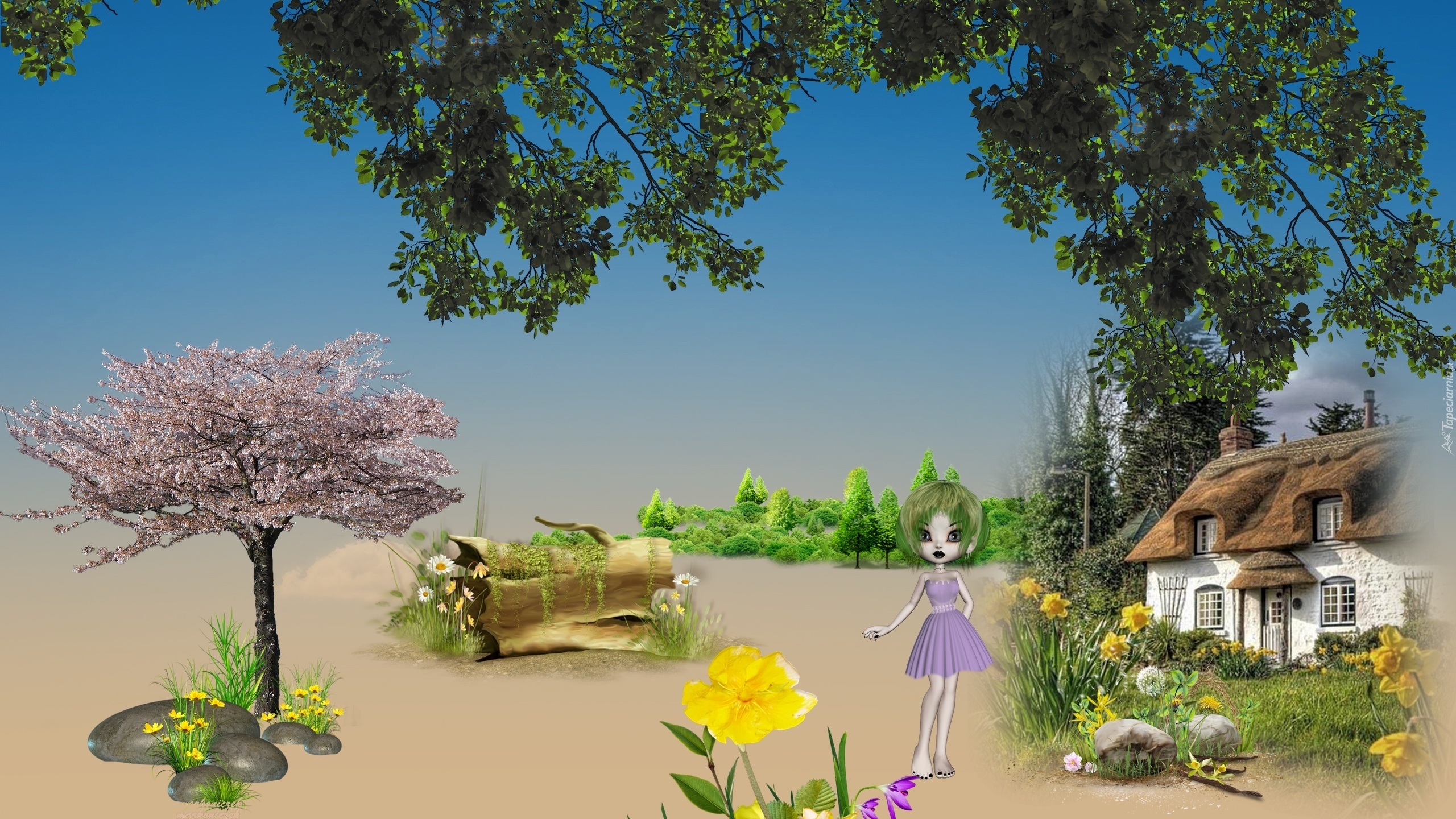 Edytor tapety: Grafika, Drzewo, Dom, Laleczka, Kwiaty
