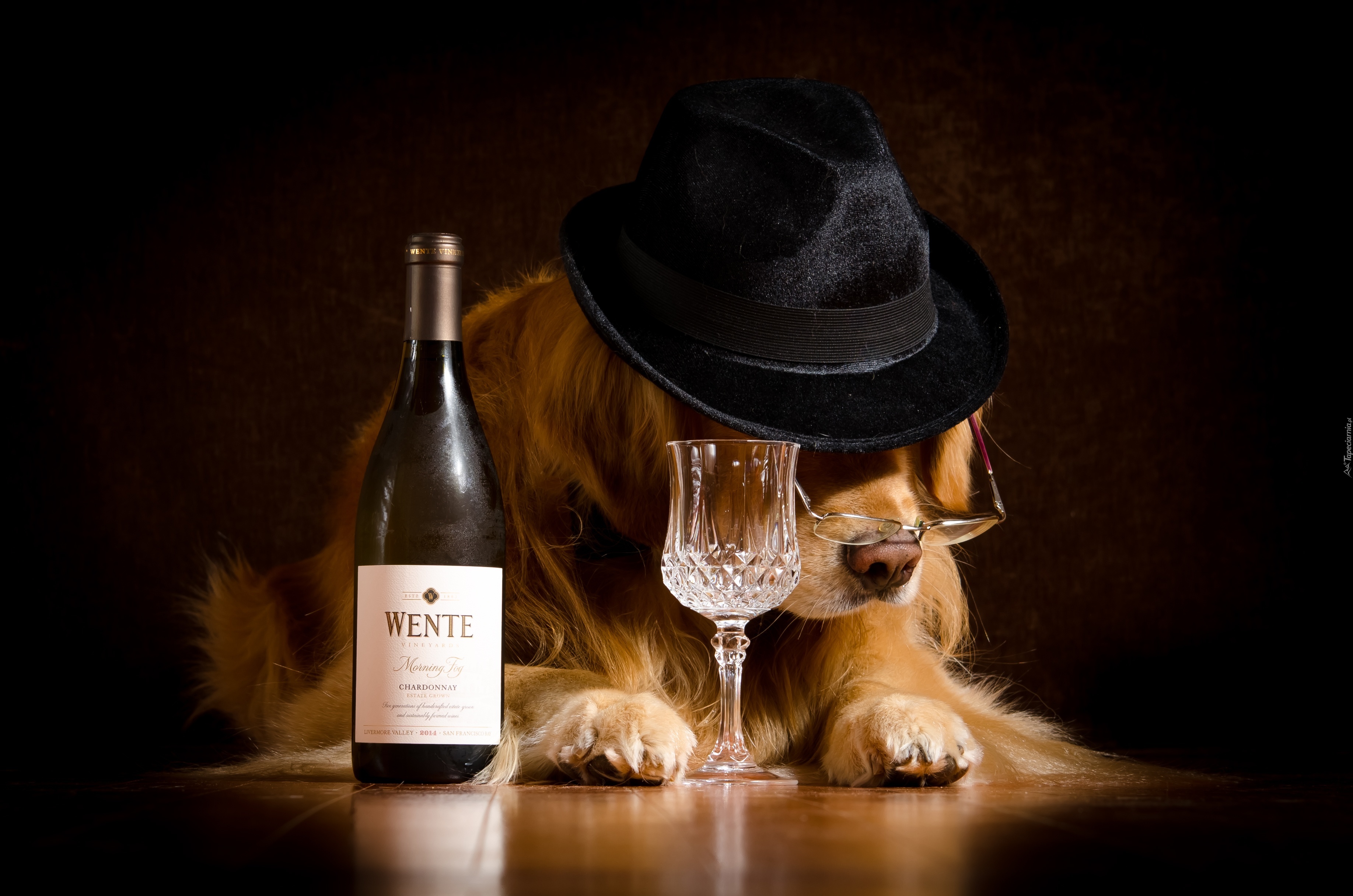 Edytor tapety: Śmieszne, Pies, Kapelusz, Butelka, Wina, Kieliszek
