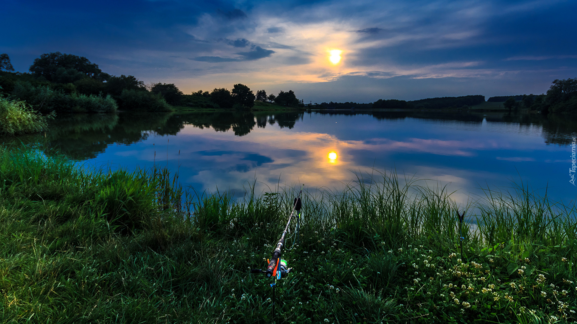 Edytor tapety: Jezioro, Wędka, Drzewa, Poranek, Wschód, Słońca