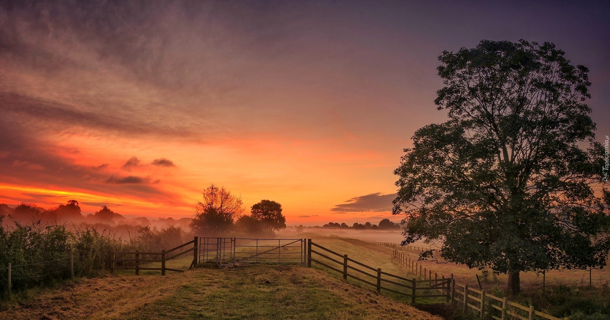 Edytor tapety: Pole, Drzewo, Zachód, Słońca, Ogrodzenie