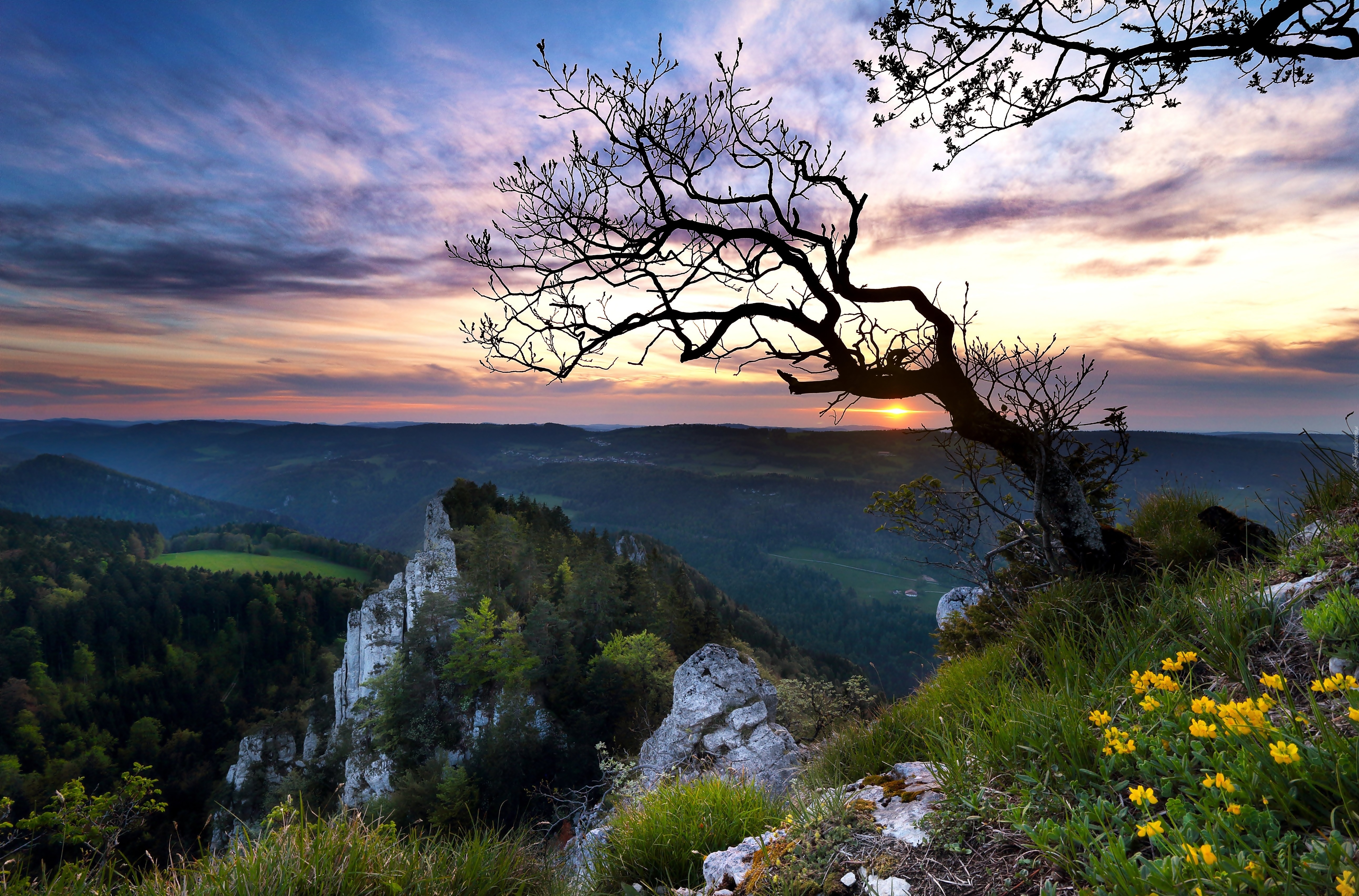 Edytor tapety: Góry, Skały, Zachód słońca, Drzewo, Kwiaty, Roślinność