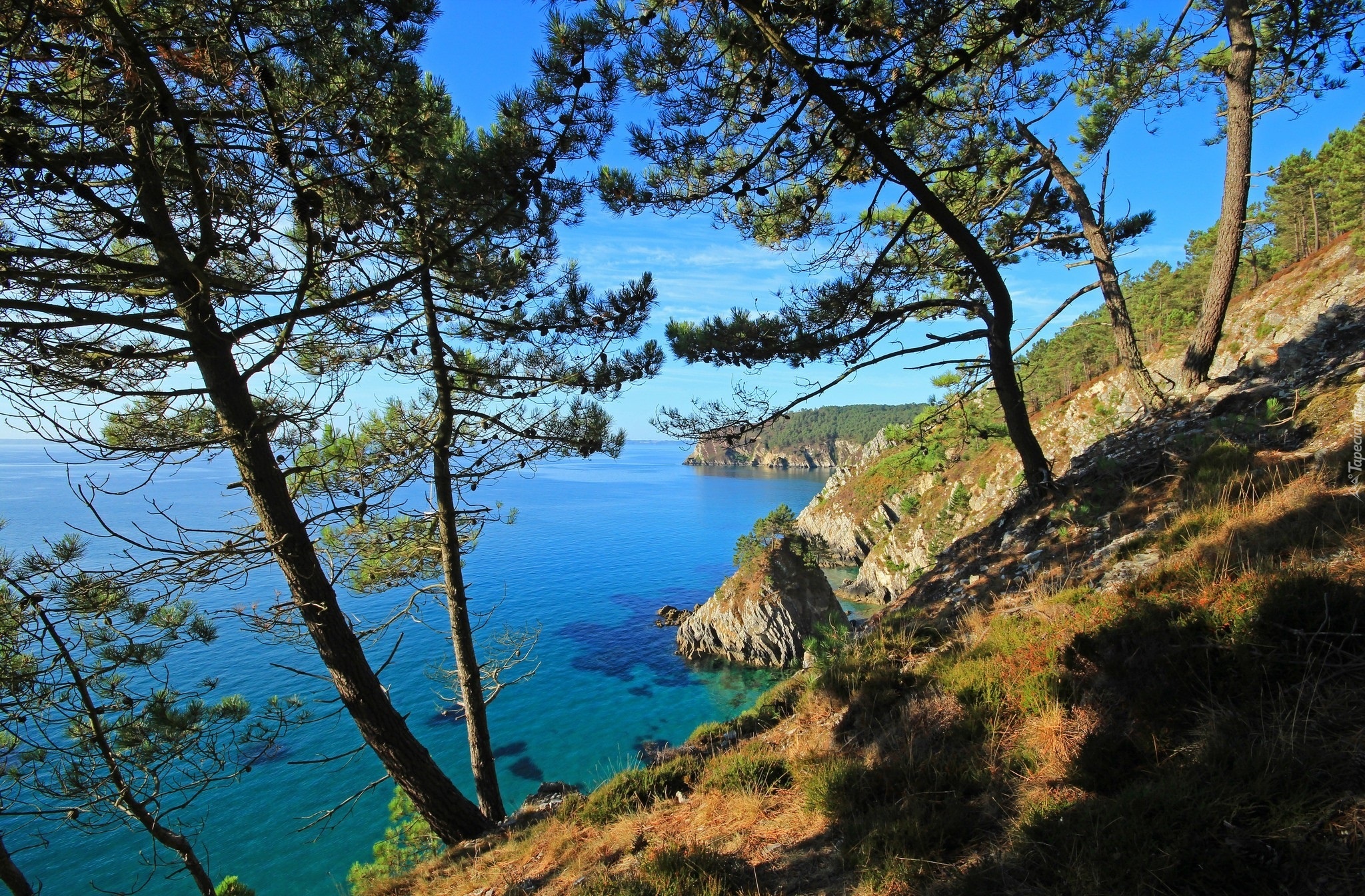 Edytor tapety: Morze, Wzgórza, Skały, Drzewa