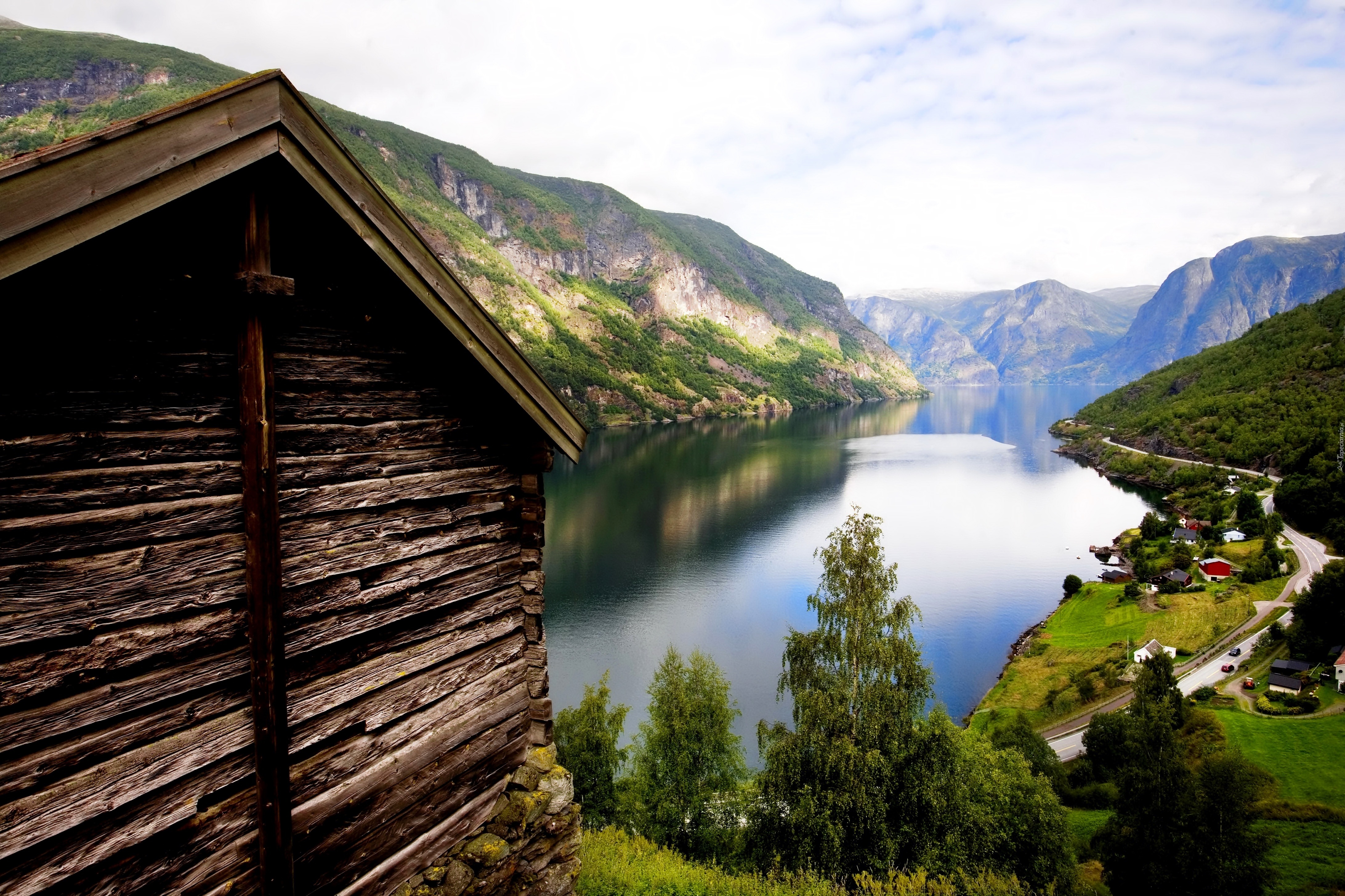 Edytor tapety: Wioska, Nad, Jeziorem, Droga, Góry