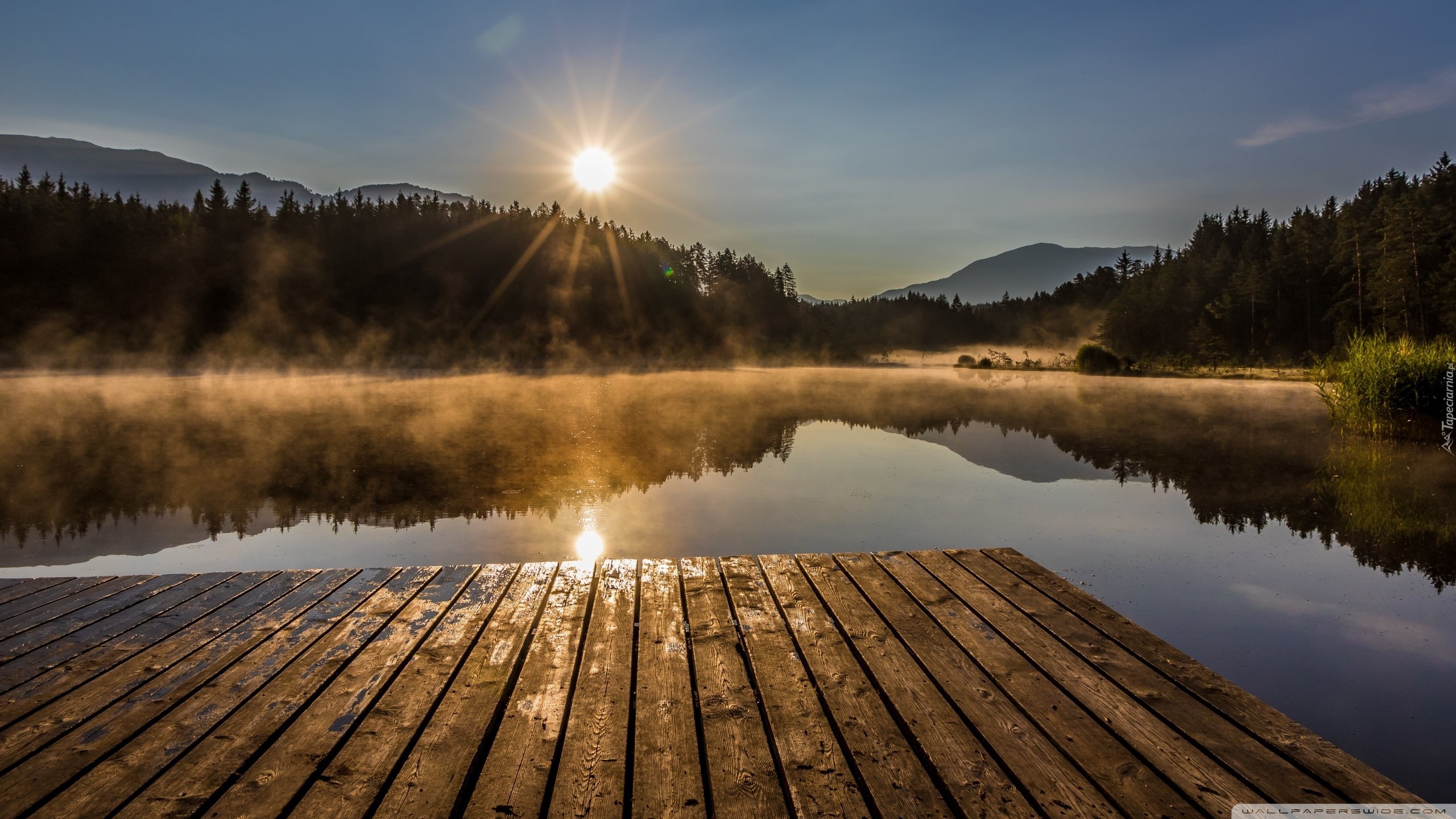 Edytor tapety: Jezioro, Mgła, Góry, Las, Promienie, Słońca, Pomost