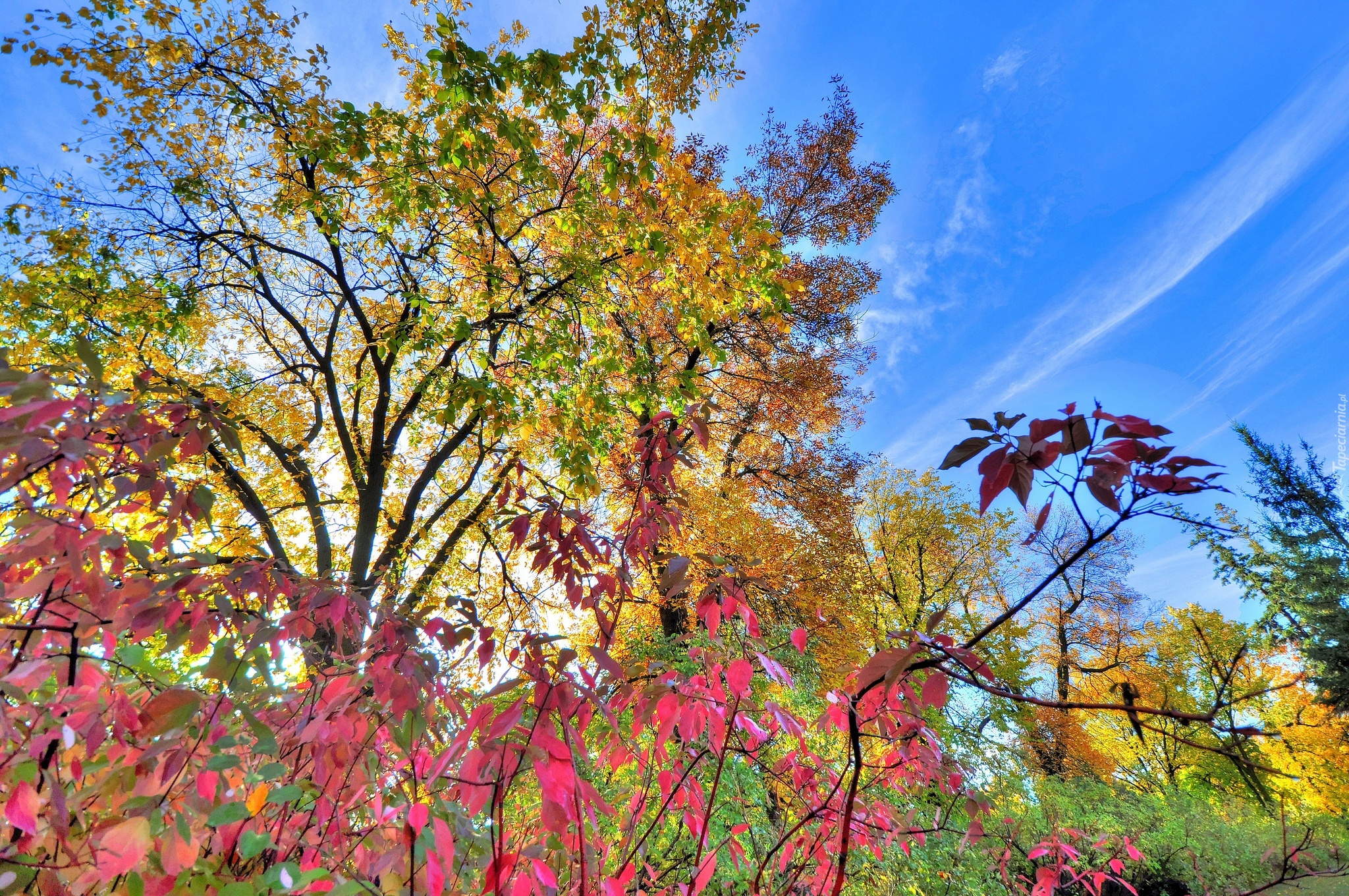 Edytor tapety: Jesień, Drzewa, Krzewy, Kolorowe, Liście, Niebo