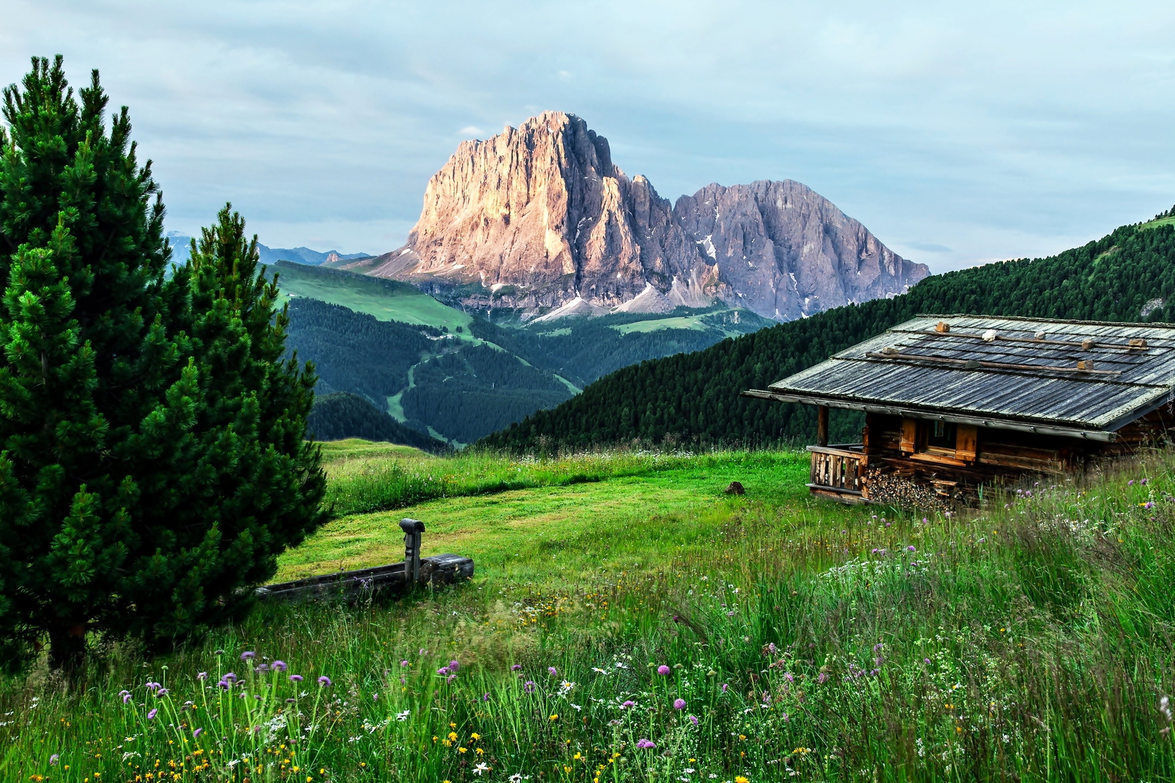 Edytor tapety: Góry, Chata, Drzewa, Łąka, Roślinność