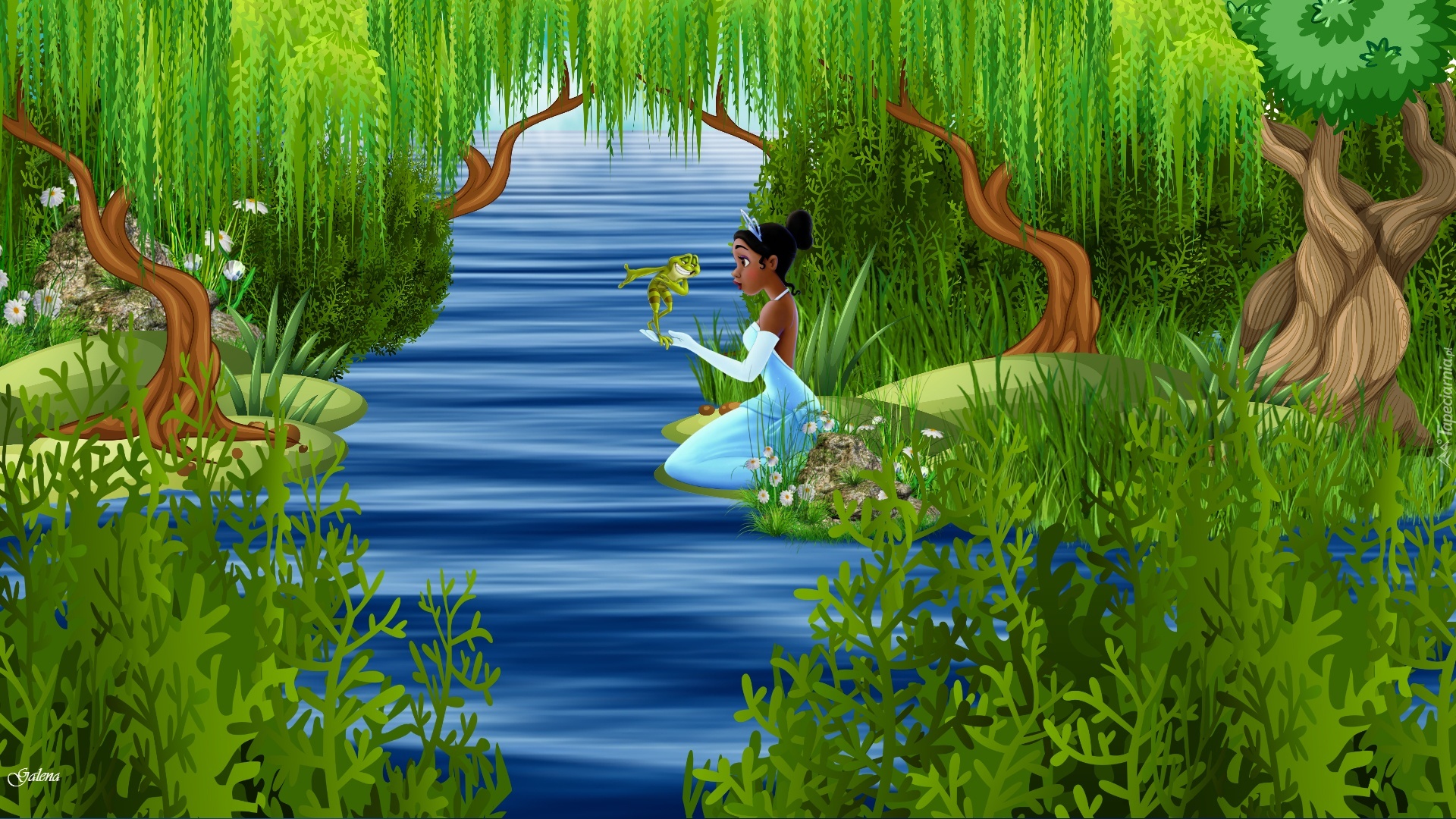 Edytor tapety: Księżniczka, Żaba, Jezioro, Drzewa, Dla dzieci, Grafika