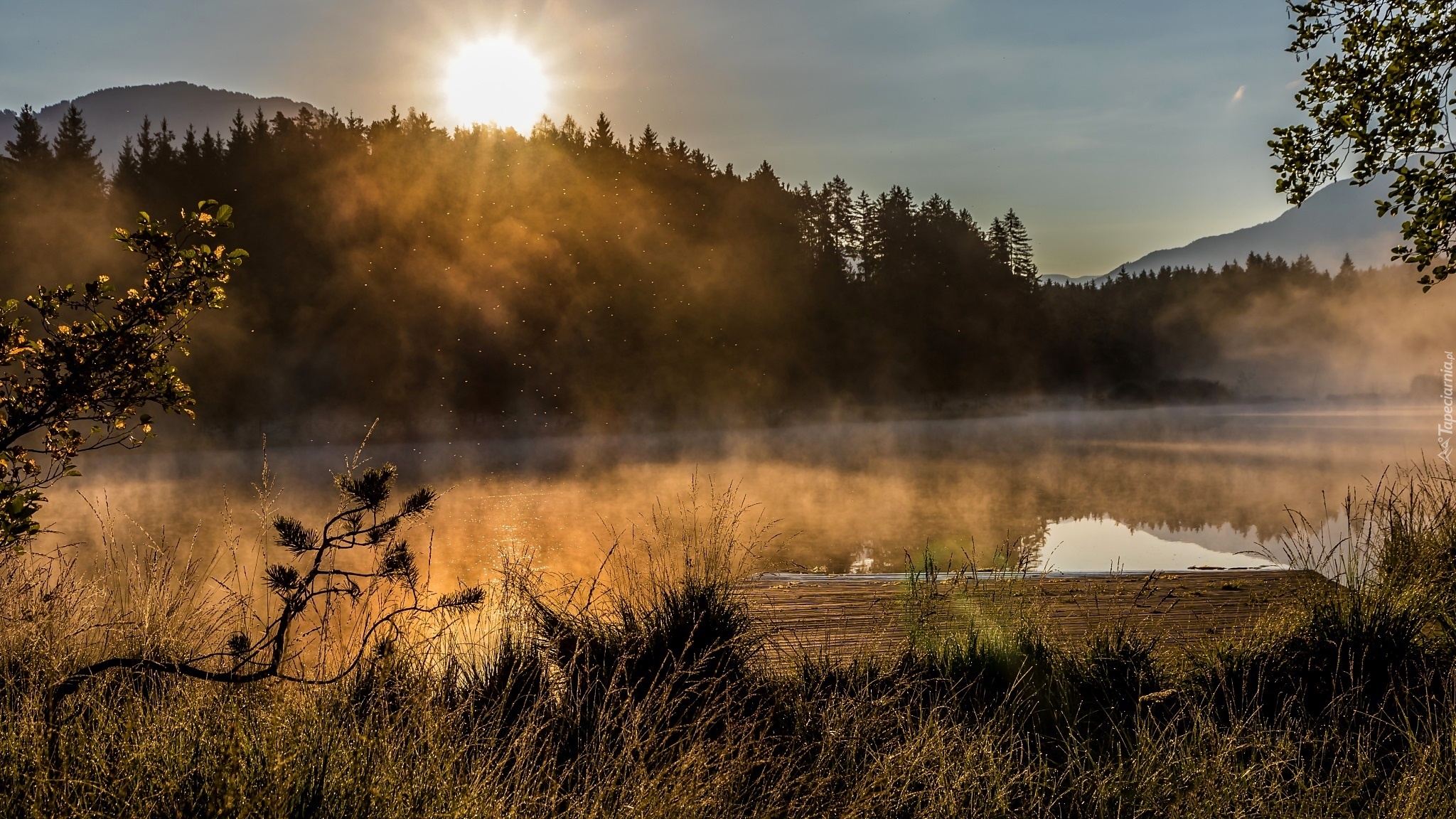 Edytor tapety: Jezioro, Mgła, Las, Promienie, Słońca