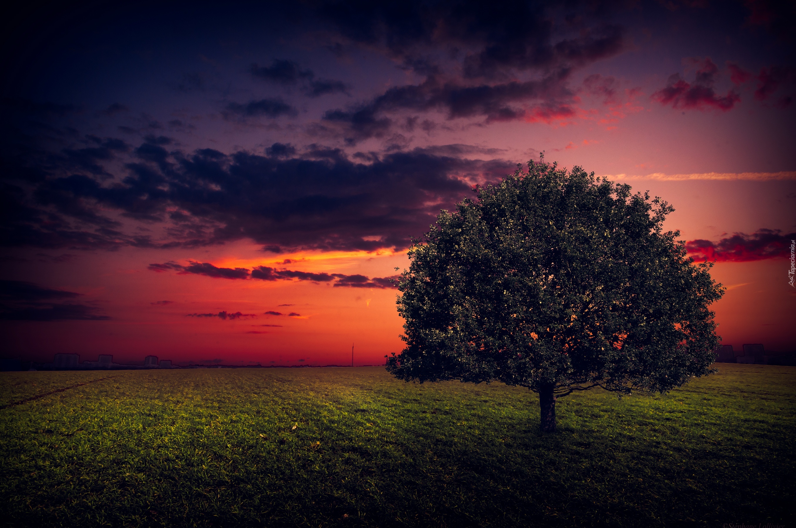 Edytor tapety: Zachód, Słońca, Pole, Drzewo