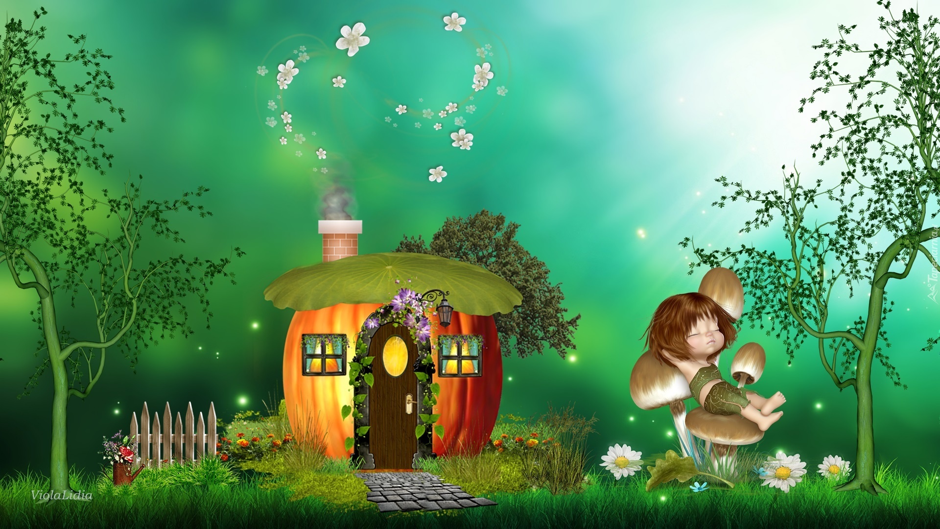 Edytor tapety: Grafika, Domek, Laleczka, Drzewa, Grzyby