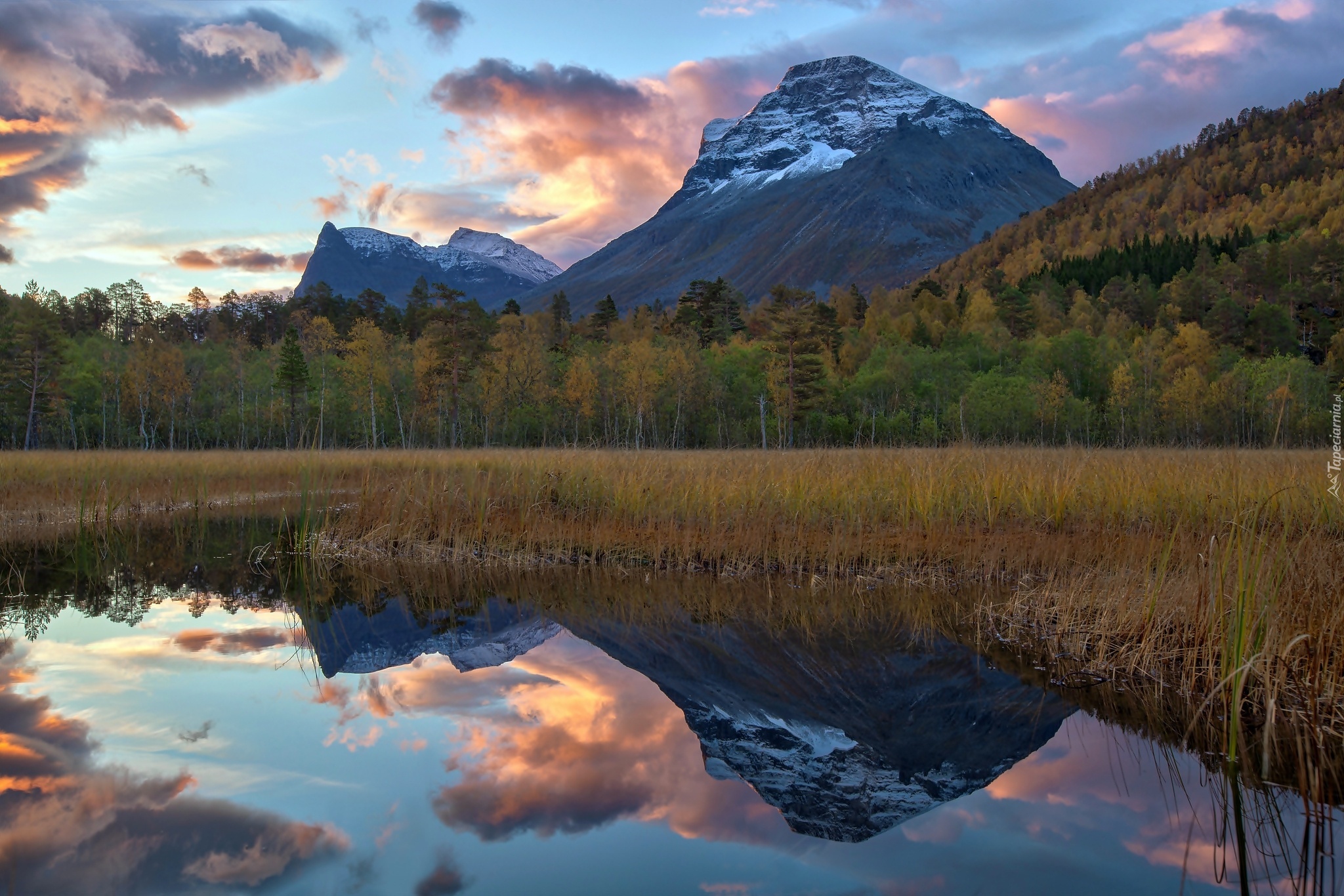 Edytor tapety: Góry, Las, jezioro, Odbicie
