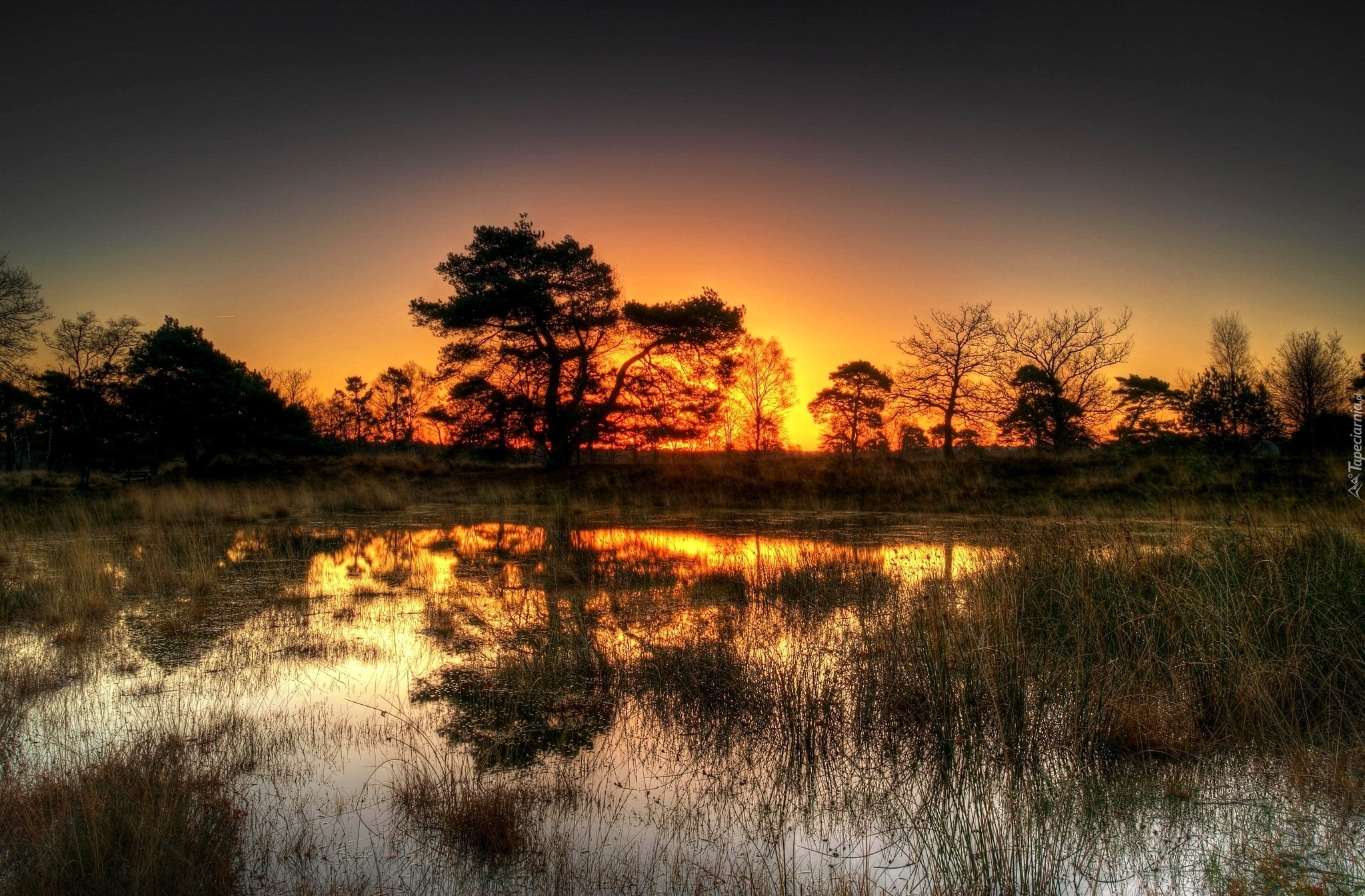 Edytor tapety: Staw, Drzewa, Trawy, Zachód, Słońca