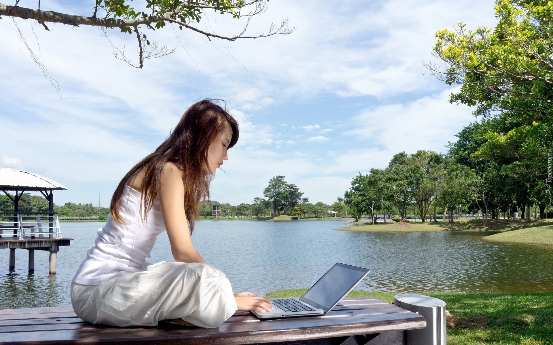 Edytor tapety: Jezioro, Kobieta, Laptop