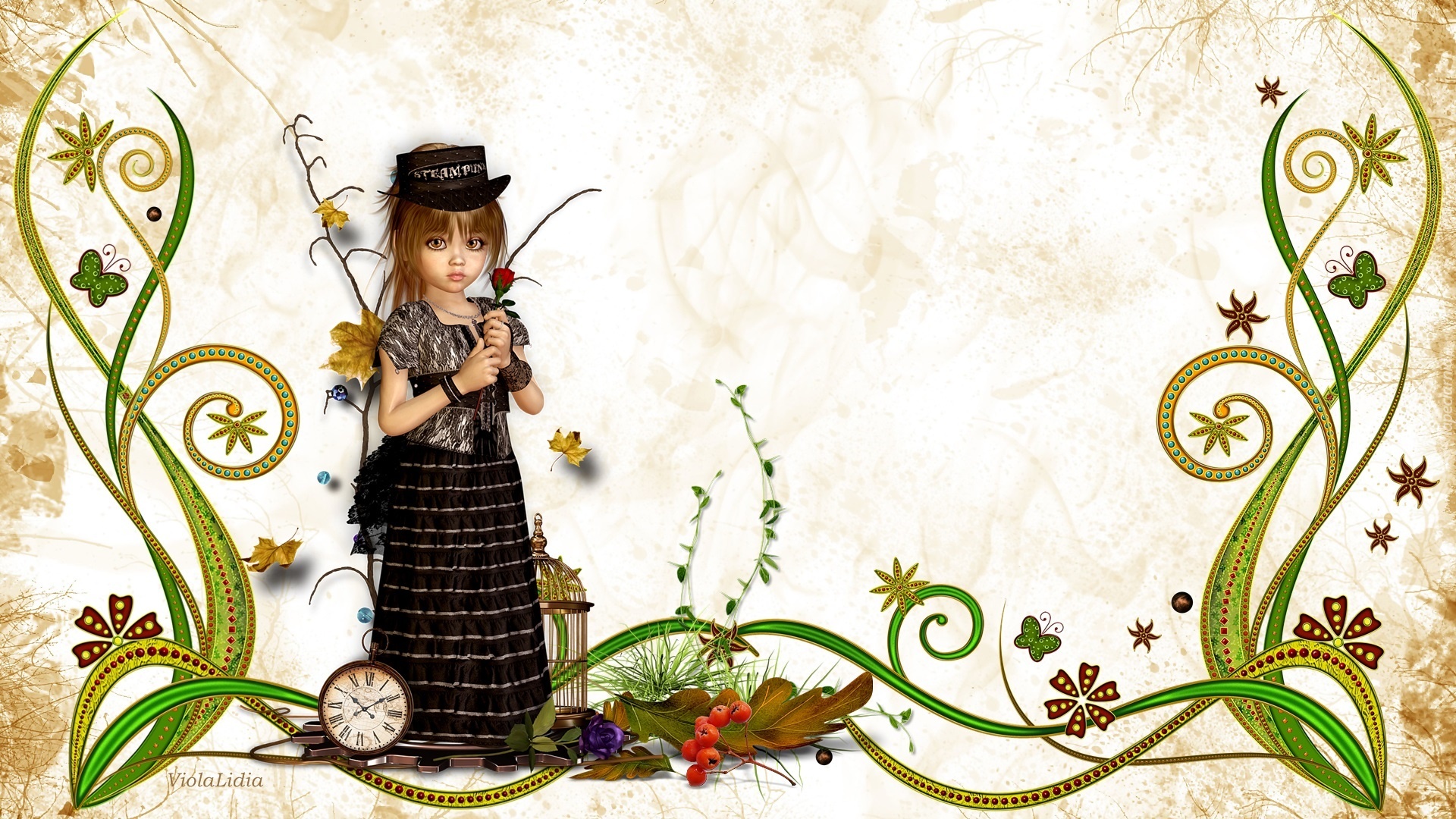 Edytor tapety: Grafika, Laleczka, Jesień, Liście, Zegar
