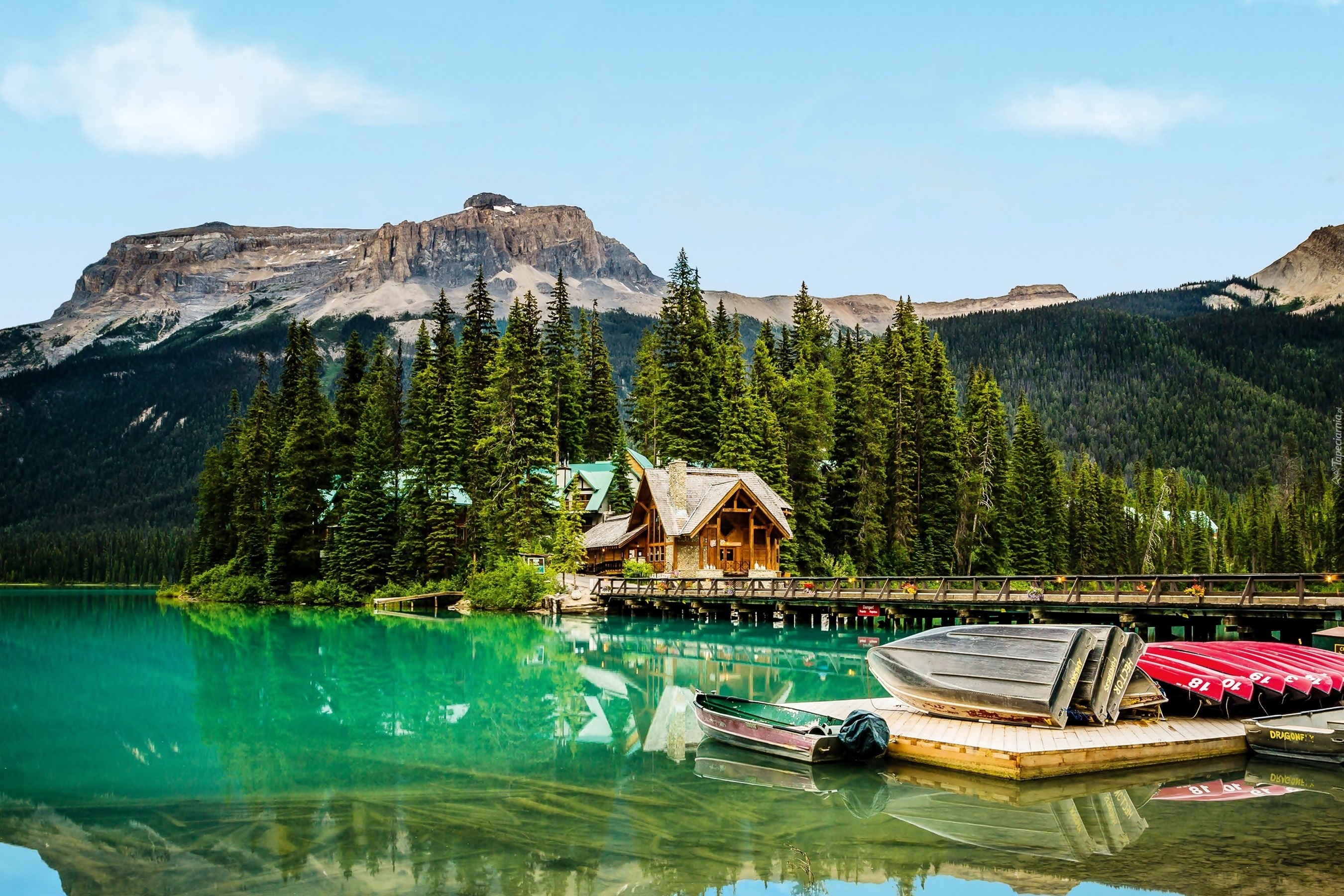 Edytor tapety: Jezioro, Góry, Las, Łodzie, Molo, Domki