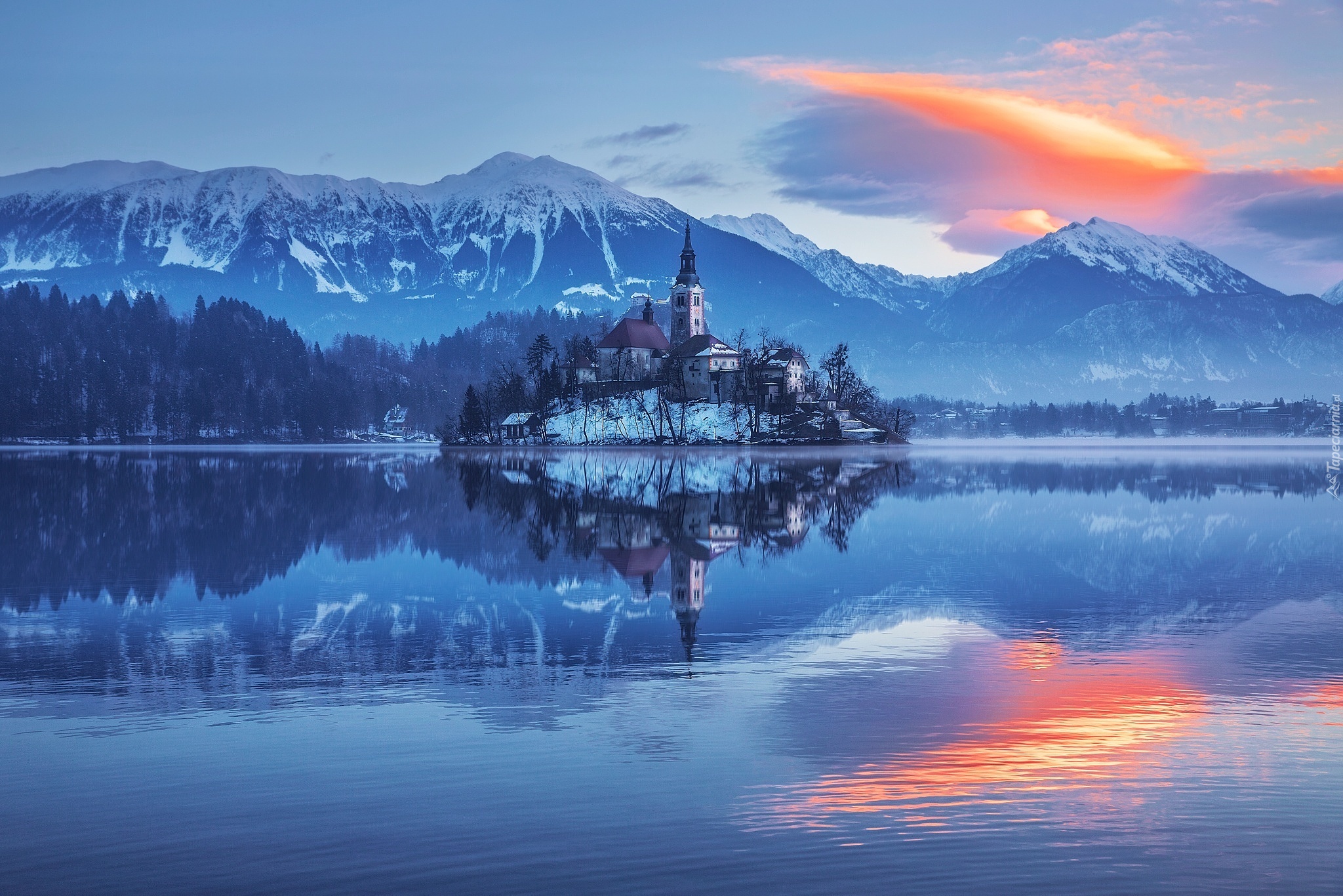 Edytor tapety: Kościół, Góry, Jezioro, Odbicie