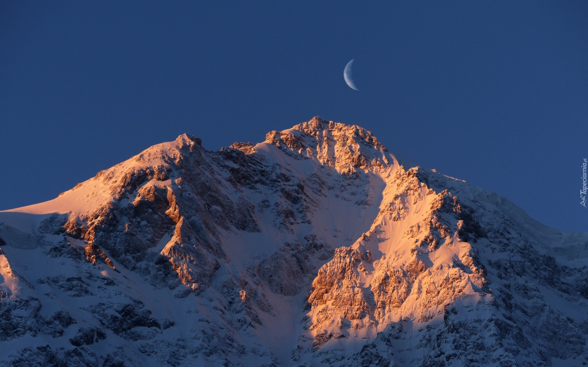 Edytor tapety: Zachód, Słońca, Góry, Śnieg, Księżyc
