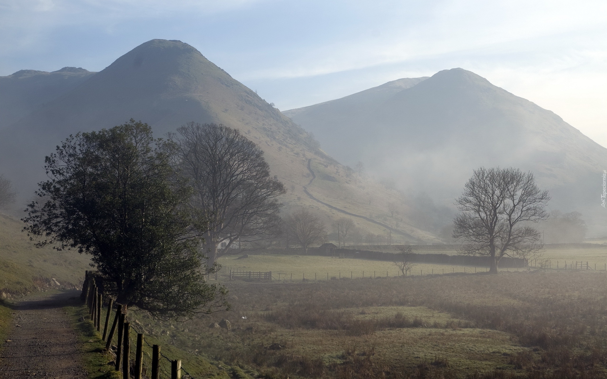 Edytor tapety: Góry, Łąka, Drzewa, Płot, Droga, Mgła