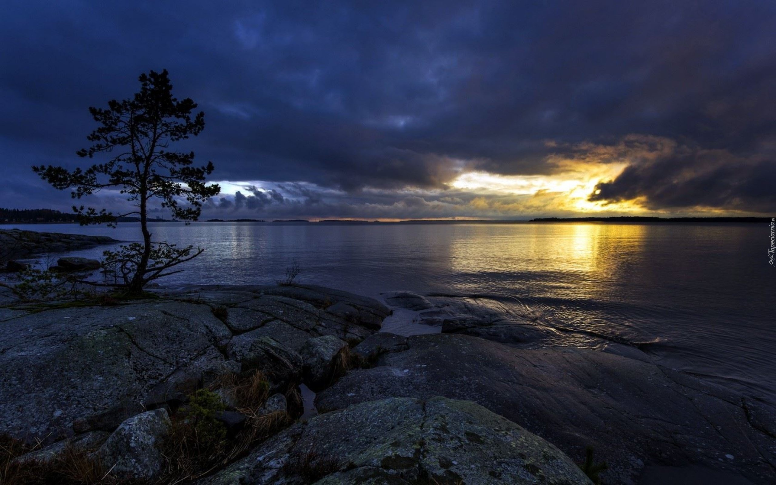Edytor tapety: Morze, Drzewo, Skały, Chmury, Zachód, Słońca