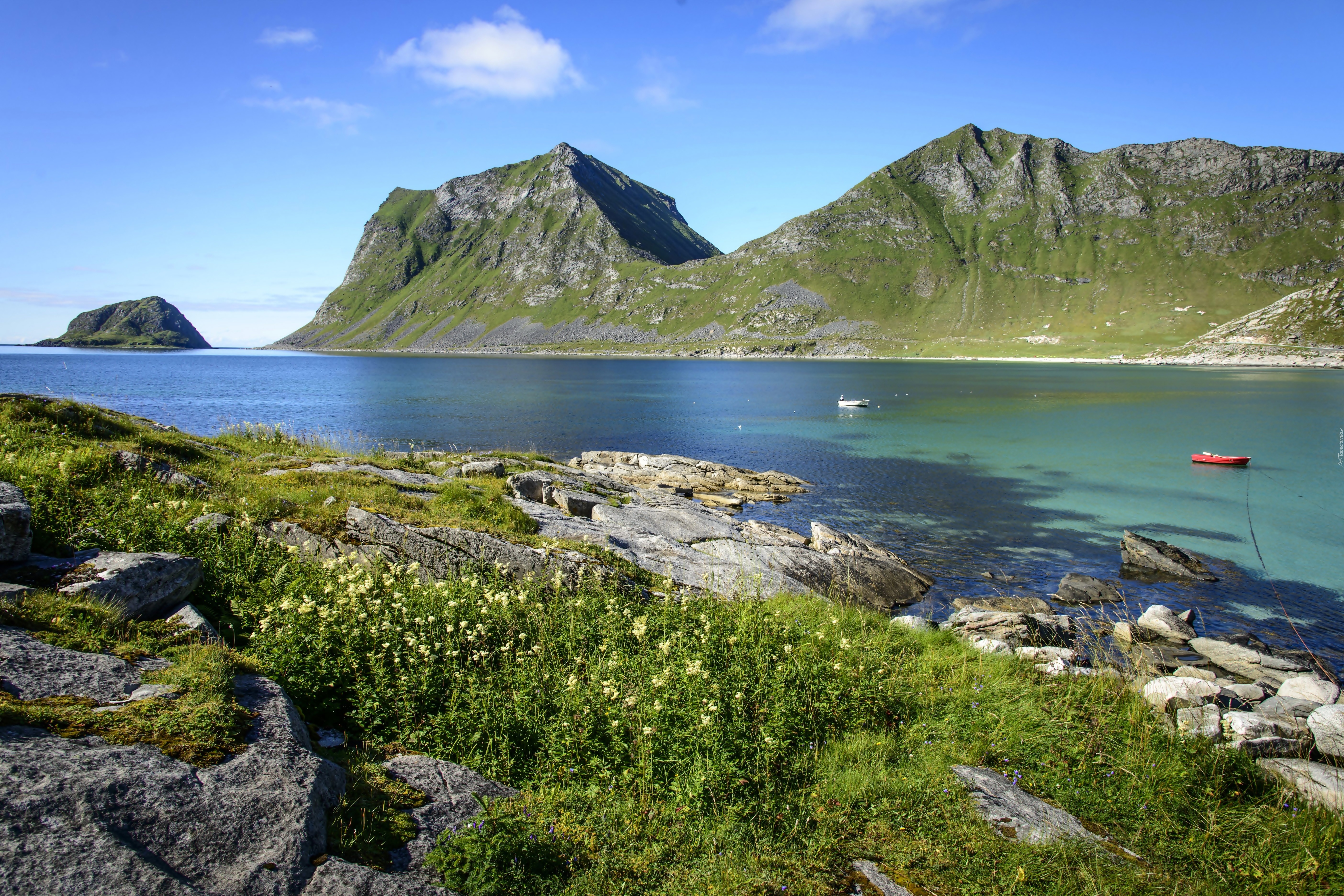 Edytor tapety: Góry, Jezioro, Kamienie, Łodzie, Norwegia, Roślinność