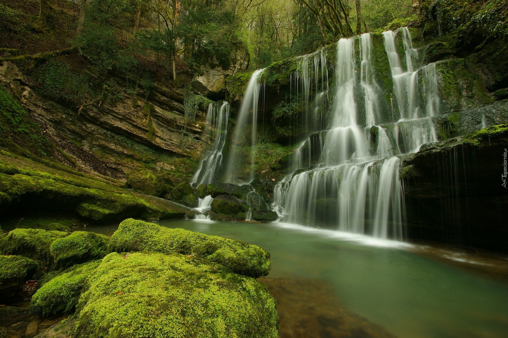 Edytor tapety: Wodospad, Skały, Mech