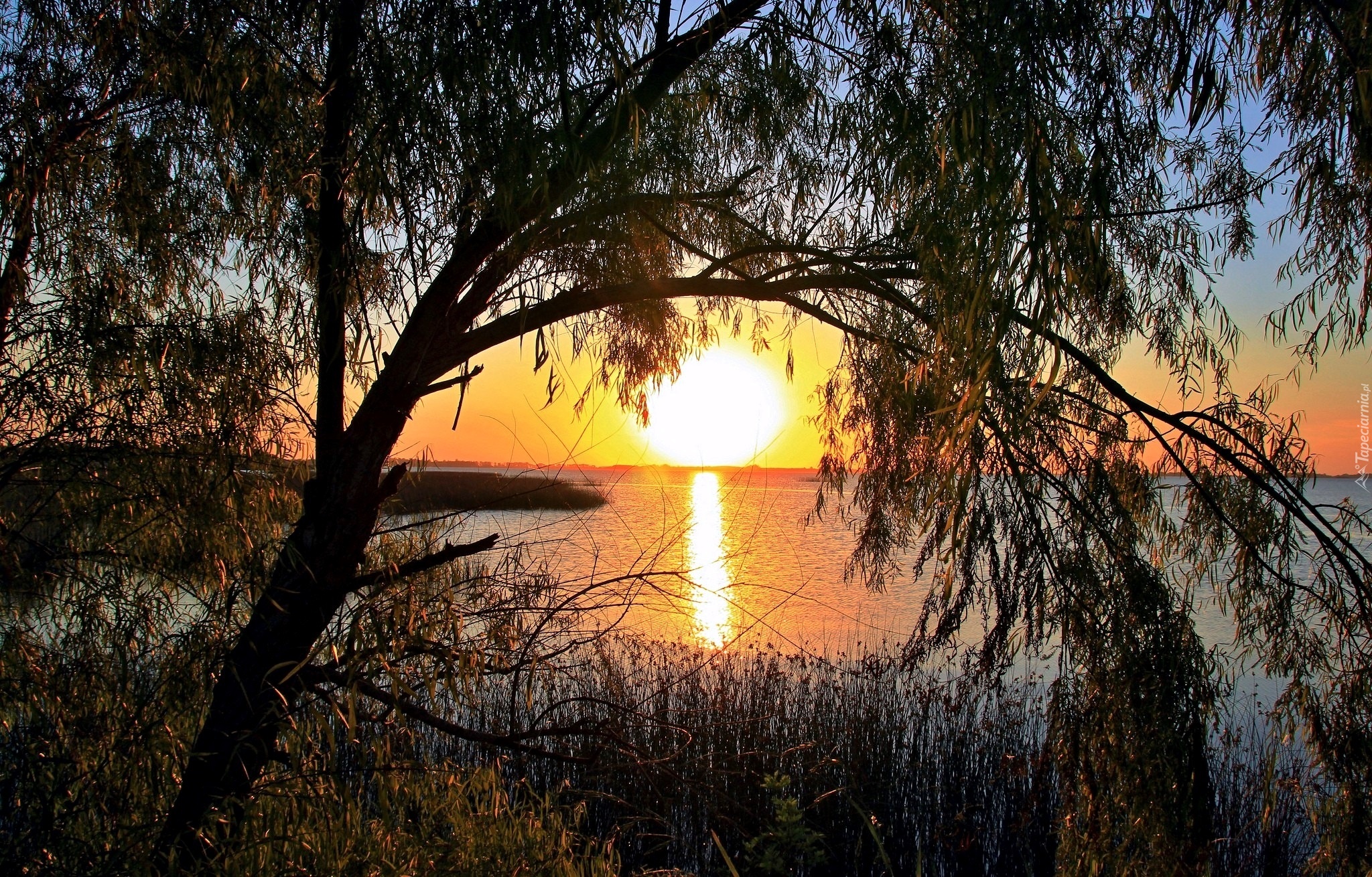 Edytor tapety: Jezioro, Drzewo, Zachód, Słońca
