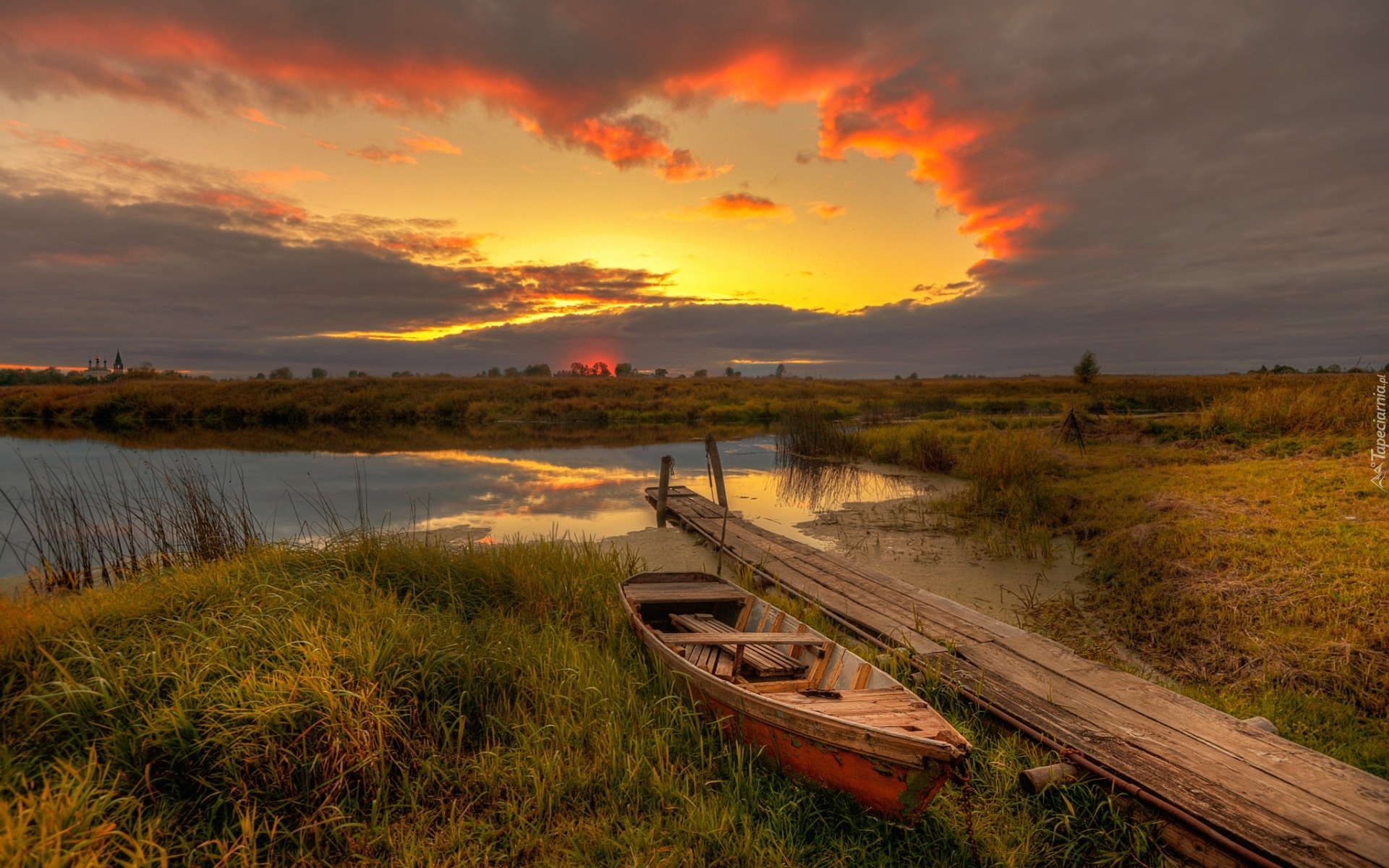 Edytor tapety: Zachód, Słońca, Jezioro, Pomost, Łódka