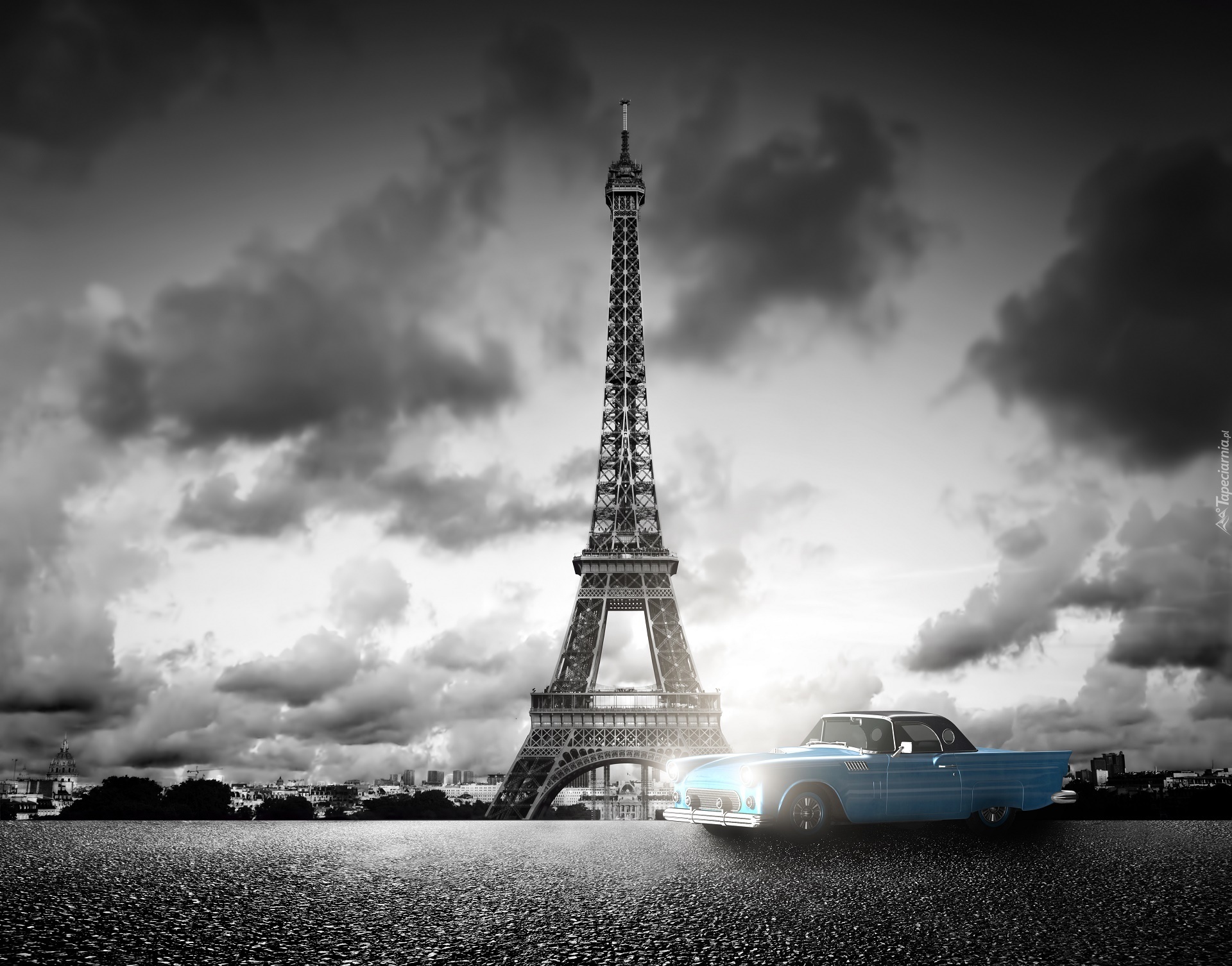 Edytor tapety: Paryż, Wieża Eiffla, Samochód, Niebieski