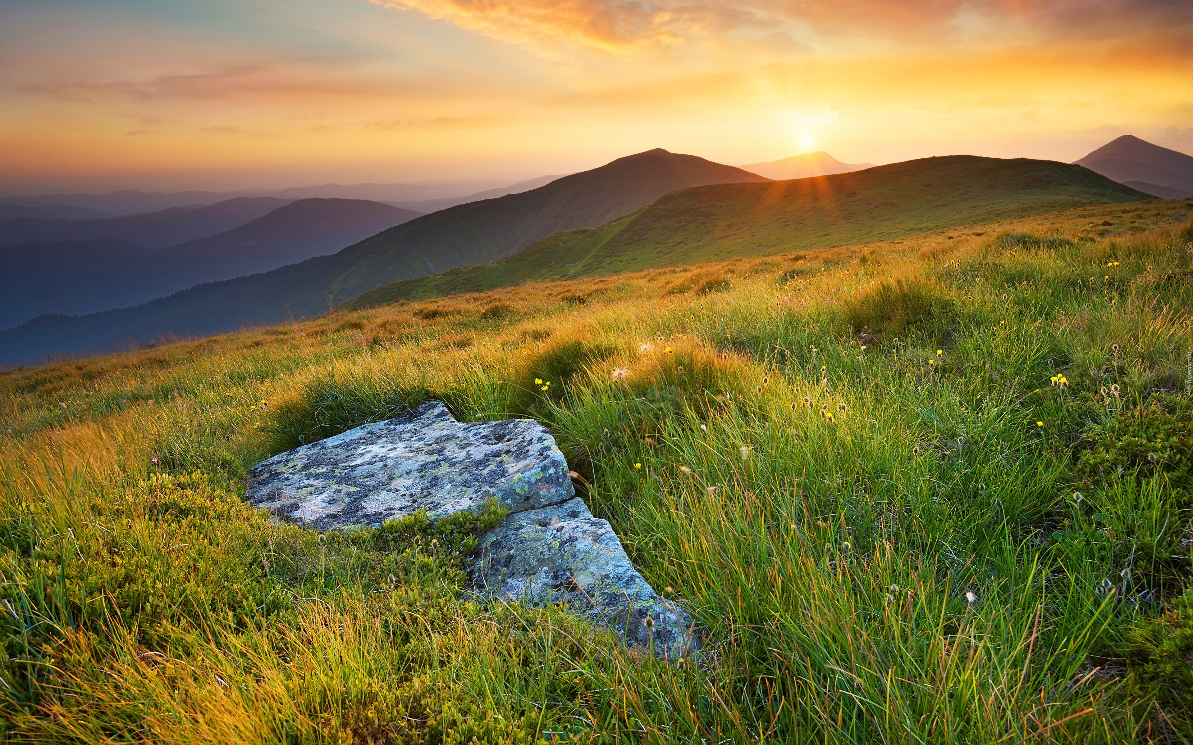 Edytor tapety: Góry, Zachód, Słońca, Trawa, Kamienie