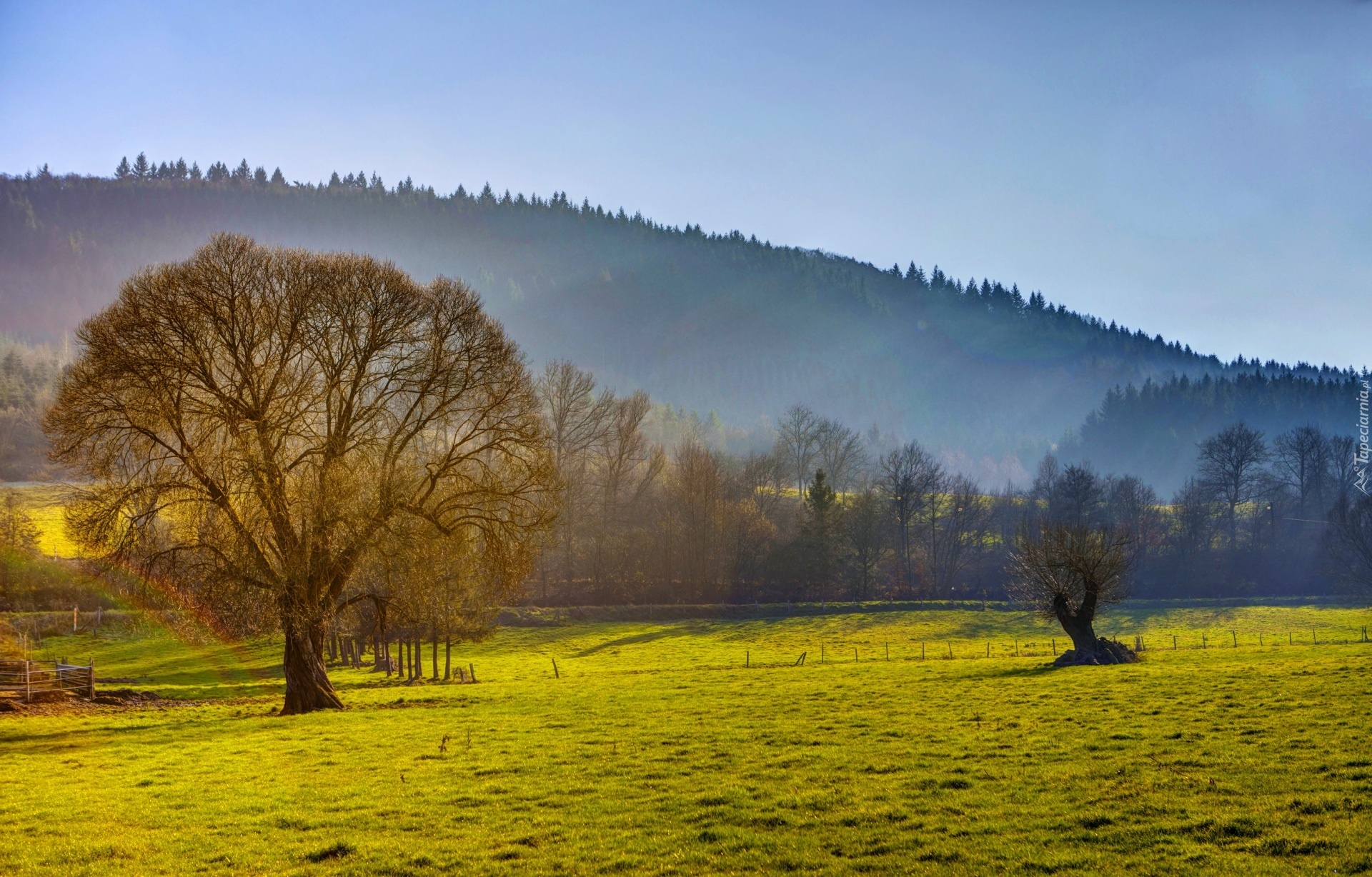 Edytor tapety: Zalesione, Wzgórza, Pole, Drzewa, Mgła