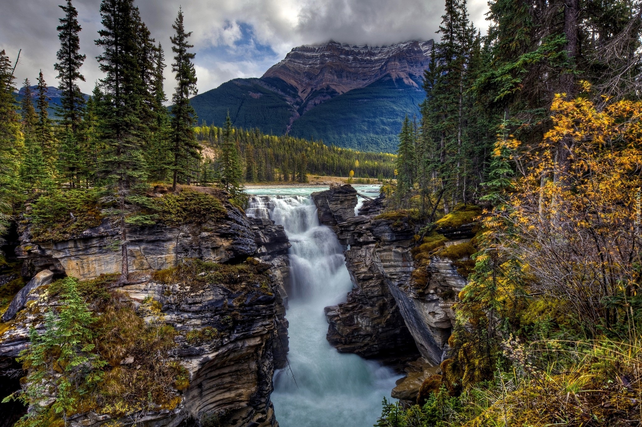 Edytor tapety: Góry, Skały, Drzewa, Wodospad
